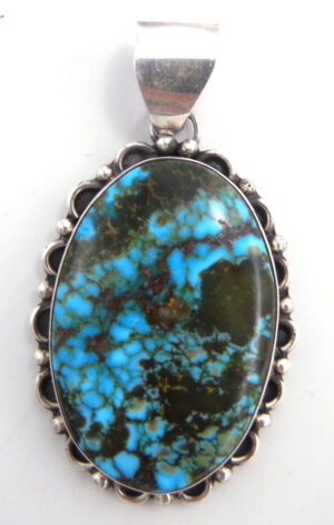 An oval piece of beautiful blue turquoise containing hints of green coloration and large portions of brown matrix comprises the majority of this traditional pendant by Navajo silversmith Juan Guerro.  The stone is set in a simple sterling silver bezel and surrounded at the base by alternating applique sterling half moons and dots.  2″ long x 1 1/8″ wide.
