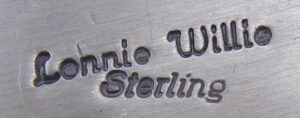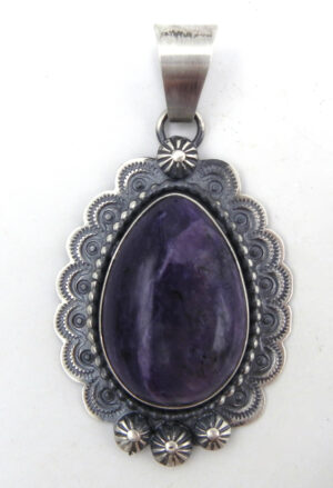 A large, tear drop shaped piece of lovely purple Charoite rests at the center of beautiful sterling silverwork in this handmade pendant by Navajo silversmith Lonnie Willie.  the stone is set in a simple sterling silver bezel and surrounded at the base by a row of small, applique sterling dots.  This, in turn, is surrounded by a scallop edged brushed sterling panel stamped with scallop and crescent moon designs and finished at the bottom with three applique sterling stars with another just below the bail.  2 5/8″ long including bail x 1 1/2″ wide.