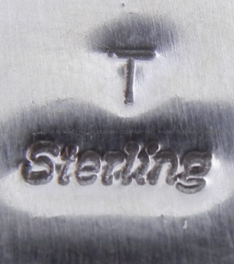 One round and one oblong piece of bumblebee jasper combine with sterling silver to create an adorable dog in this fun pendant by Navajo silversmith Mary Tso. The round stone comprises the dog’s head, finished on each side with floppy sterling silver ears.  The dog’s bumblebee jasper body is bordered on its longer sides by a row of sterling flower patterns, while its limbs and tail also comprise sterling silver.  The stones are set in sawtooth sterling silver bezels, while the tail is finished with three applique sterling stars.  3 1/8″ long x 1 1/2″ wide.