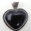 A single, heart shaped piece of onyx is surrounded by sterling silver in this simple yet elegant Navajo pendant.  The stone is set in a simple sterling silver bezel which is surrounded at the base by a thin sterling band, stamped and cut out in three places to form a reoccurring pattern.  1 3/4″ long including bail x 1 3/8″ wide.