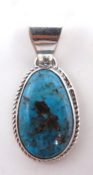 A small, tear drop shaped pieced of medium blue turquoise containing portions of brown matrix running throughout creates the focal point of this delicate Navajo pendant. The stone is set in a simple sterling silver bezel and surrounded at the base by a sterling silver rope pattern. 1 1/4″ long including bail x 1/2″ wide.