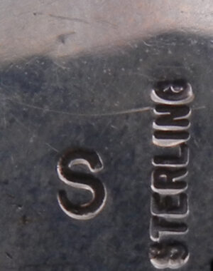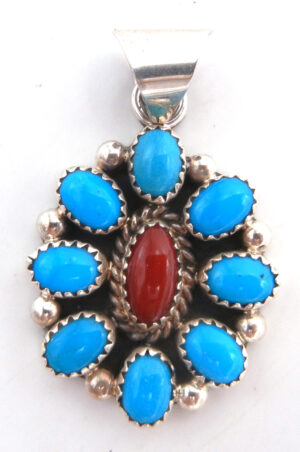 A single, oval coral piece is surrounded by eight bright blue turquoise stones in this fun Navajo cluster pendant.  The coral piece is surrounded at the base by a sterling silver rope pattern, while the surrounding stones are all separated by applique sterling dots.  All stones are set in sawtooth sterling silver bezels.  1 1/2″ long including bail x 1″ wide.