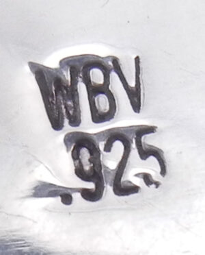 A vibrant spiny oyster shell piece varying light to medium orange in color is surrounded by sterling silver in this traditional pendant by Navajo silversmith Walter Vandever. The stone is set in a notched sterling silver bezel surrounded at the base by a row of thin, domed sterling silver bands, followed by a thick sterling band stamped on one side with fine lines and cut out with triangle patterns. 2″ long including bail x 1 1/8″ wide.
