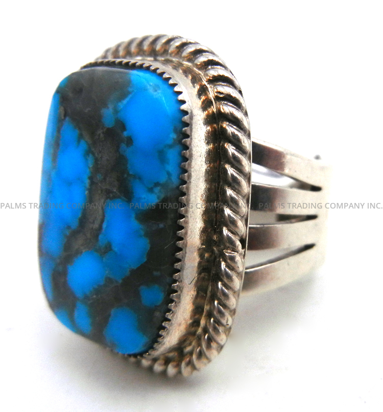 A rectangular piece of bright blue turquoise containing thick portions of grey matrix running throughout comprises the majority of this traditional ring by Navajo silversmith Alice McShirley.  The stone is set in a sawtooth sterling silver bezel and surrounded at the base by a sterling silver rope pattern, while stone and silverwork rest atop a wide, split sterling silver shank that merges halfway toward the back.  1″ long x 3/4″ wide. Fits ring size 6 3/4.