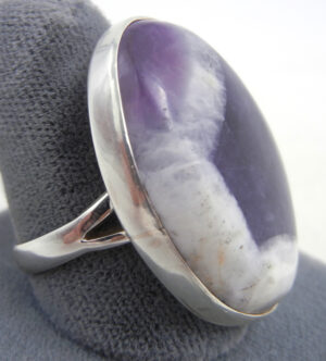 A large, oval piece of lovely purple and white Chevron amethyst comprises the majority of this simple yet elegant Navajo ring.  The stone is set in a simple sterling silver bezel, and stone and silverwork are set atop a split sterling silver shank that merges almost immediately.  1 1/4″ long x 7/8″ wide.  Fits ring size 8 1/4.