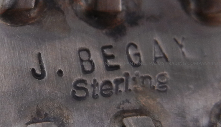An oval piece of multi-colored bumblebee jasper creates the focal point of this traditional ring by Navajo silversmith Joe Begay.  The stone, varying yellow to grey to black to off-white, is set in a simple sterling silver bezel and surrounded at the base by a sterling silver rope pattern.  This, in turn, is surrounded by a thin sterling band stamped and cut out to form a reoccurring pattern.  Stone and silverwork are set on a thrice split sterling silver shank that merges halfway toward the back. 1 1/8″ long x 3/4″ wide. Fits ring size 6.