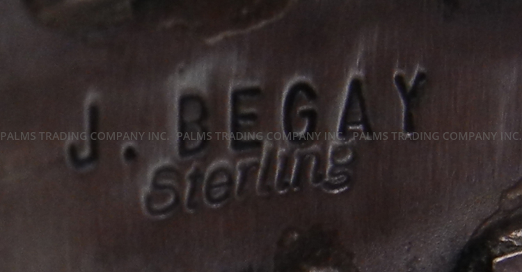 A single, oval piece of yellow and grey bumblebee jasper comprises the majority of this traditional ring by Navajo silversmith Joe Begay.  The stone, set in a simple sterling silver bezel, is surrounded by a thin sterling silver rope pattern, followed by a thin sterling band stamped along the center of each side and along top and bottom. Stone and silverwork are set atop a thrice split sterling silver shank that merges halfway toward the back.  1 1/4″ long x 3/4″ wide.  Fits ring size 7.