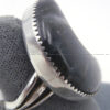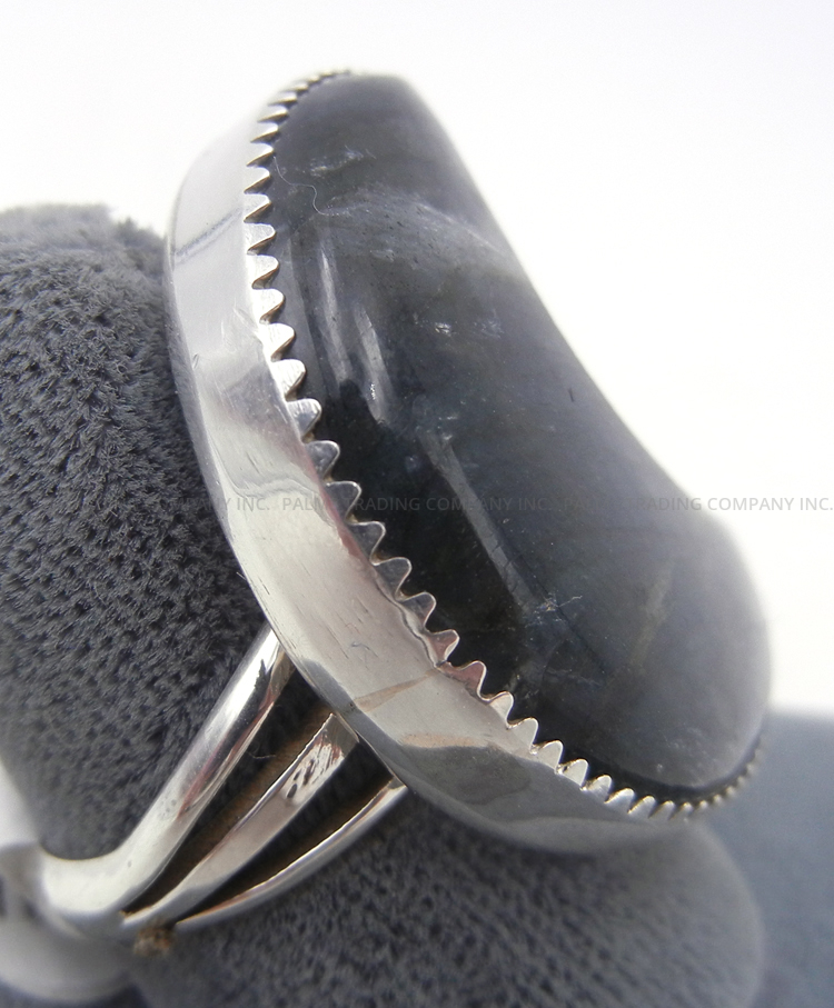 A single, crescent moon shaped piece of labradorite creates the majority of this fun Navajo ring. The labradorite stone varies grey to black and shines differently depending upon how light hits it, and is set in a sawtooth sterling silver bezel. Stone and silverwork are set on a thrice split sterling silver shank that merges halfway toward the back. 1 1/8″ long x 3/4″ wide. Fits ring size 6 1/2.