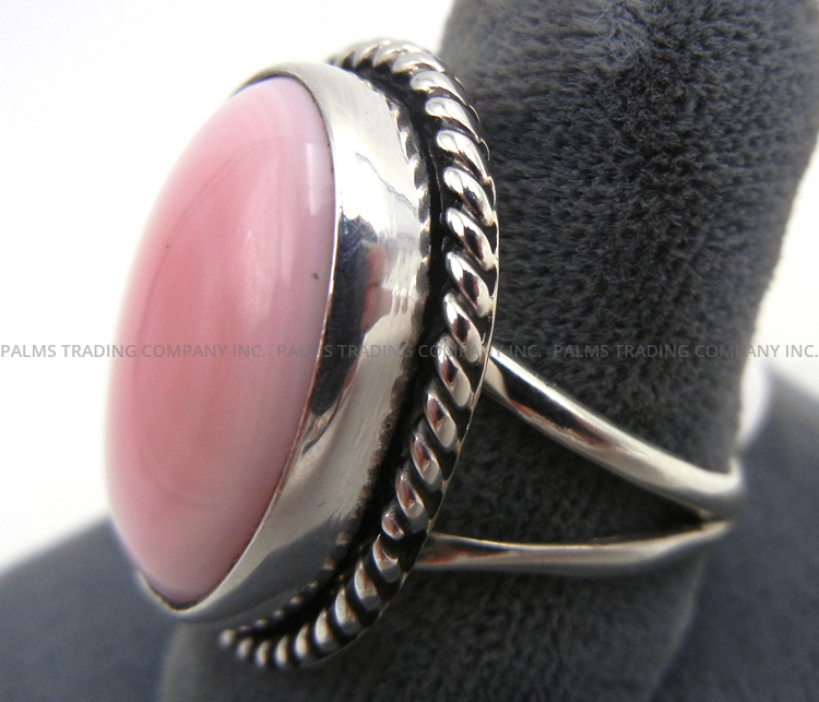 An oval piece of pink conch varying near white to medium pink in color is surrounded by simple sterling silver accents and set atop a split sterling silver shank in this lovely Navajo ring. The stone is set in a simple sterling silver bezel and surrounded at the base by a sterling silver rope pattern, while the piece’s shank merges halfway toward the back.  1″ long x 3/4″ wide.  Fits ring size 8.