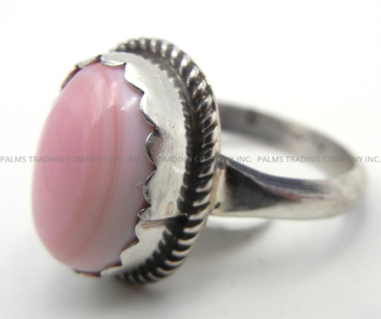 Set in a scalloped sterling silver bezel, a single, oval piece of pink conch creates the focal point of this delicate Navajo ring.  The stone is surrounded at the base by a sterling silver rope pattern and set atop a solid sterling silver shank. 5/8″ long x 1/2″ wide.  Fits ring size 8 1/4.