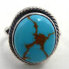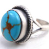 A single, small round piece of bright blue turquoise creates the focal point of this delicate Navajo ring.  The stone contains portions of brown matrix running throughout and is surrounded at the base by a sterling silver rope pattern, while stone and silverwork are set on a split sterling silver shank that merges 1/4 of the way toward the back.  Fits ring size 6. 5/8″ long x 5/8″ wide.