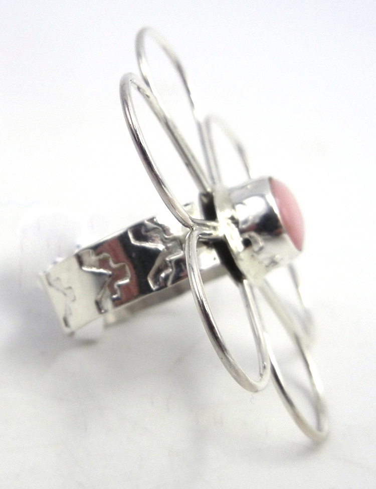 Tear drop shaped, thin bands of sterling silver surround a single, round pink conch stone in this adorable Navajo ring, forming a flower pattern.  The pink conch stone is set in a simple sterling silver bezel, and stone and silverwork are attached to an adjustable sterling silver shank stamped with reoccurring step patterns.  1 3/4″ long x 1 3/4″ wide.  Fits ring size 8 1/2.