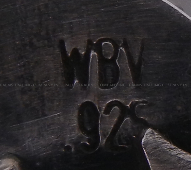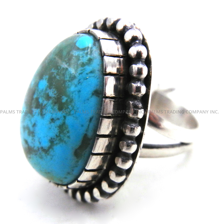 A blue-green piece of tear drop shaped turquoise is set in a notched sterling silver bezel in this lovely ring by Navajo silversmith Walter Vandever.  The stone is surrounded at the base by a row of applique sterling dots and rests atop a split sterling silver shank that merges halfway toward the back.  1″ long x 3/4″ wide.  Fits ring size 7 1/4.