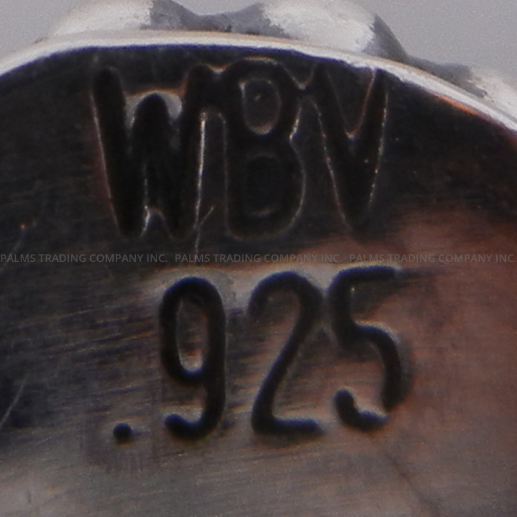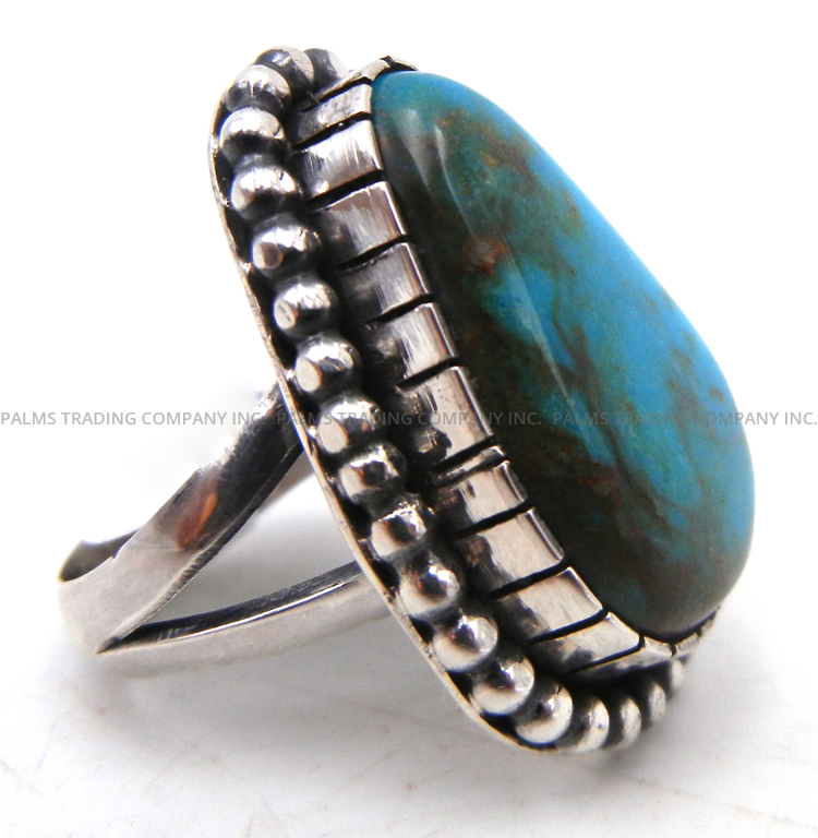 A single, rounded triangular piece of turquoise creates the focal point of this traditional ring by Navajo silversmith Walter Vandever. The stone, blue-green in color, contains portions of brown matrix running throughout and is set in a notched sterling silver bezel. It is surrounded at the base by a row of applique sterling dots, and stone and silverwork rest atop a split sterling silver shank that merges halfway toward the back. 1 1/8″ long x 3/4″ wide. Fits ring size 5 1/2.