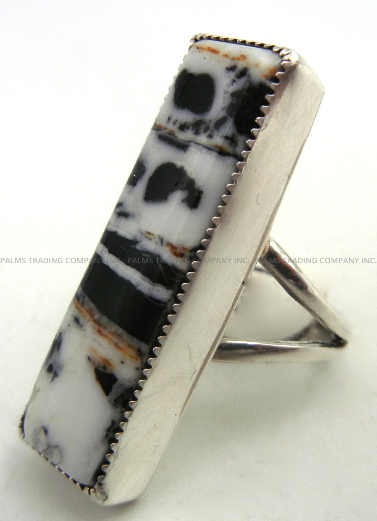 A long, rectangular piece of White Buffalo in a sawtooth sterling silver bezel comprises the entirety of this fun Navajo ring. The stone, predominantly white, contains both black and brown matrix and is set atop a split sterling silver shank that merges halfway toward the back. 1 1/4″ long x 3/8″ wide. Fits ring size 5 1/2.