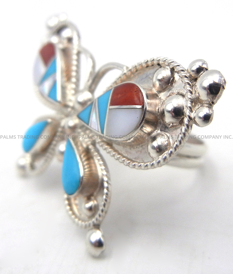 Turquoise, coral, white mother of pearl and sterling silver combine in delicate inlay along the wings of a beautiful butterfly in this gorgeous Zuni ring. The top, larger wings are inlaid with each of the aforementioned stones, while the lower, smaller wings feature only turquoise. The remainder of the ring comprises only sterling silver, with sterling rope patterns bordering each wing and applique sterling dots comprising the butterfly’s body and accenting each wing. Butterfly is set atop a double banded sterling silver shank. 1″ long x 1 1/2″ wide. Fits ring size 7 1/2.