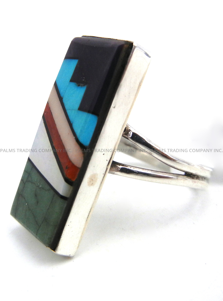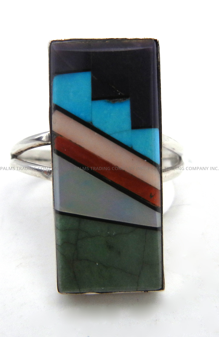 Green and blue turquoise, coral, white mother of pearl, pink conch, sugilite and jet combine in geometric inlay to form this unique and colorful Zuni ring. Inlay work is set within a simple, rectangular sterling silver bezel, which is set atop a split sterling silver shank. Fits ring size 11 1/2. 1 1/4″ long x 1/2″ wide.