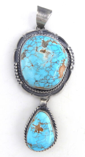One large, round turquoise piece and one smaller, tear drop shaped turquoise piece comprise the majority of this unique and eye-catching Navajo pendant.  The smaller hangs from the larger, connected by a sterling silver jump ring, while each stone is set in a simple sterling silver bezel and surrounded at the base by a sterling silver rope pattern.  The larger of the two stones is also surrounded by a sterling panel stamped with scallop patterns and cut out along the edges, finished with rows of applique sterling dots.  Each stone is light blue in color and contains large portions of light brown matrix running throughout. 3 1/8″ long including bail x 1 3/8″ wide.