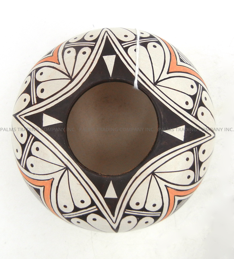 Handmade by Hopi potter Burl Naja, this gorgeous, small bowl showcases various intricate weather patterns from rim to base.  The piece is painted in black and orange atop a buff backdrop, with the top and bottom of the piece showcasing cloud patterns and the center featuring rain and water patterns.  2 3/4″ tall x 4 1/4″ wide.