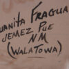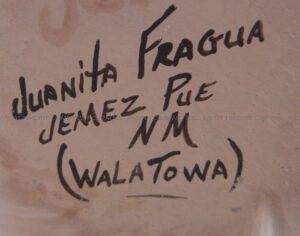 Handmade by late Jemez potter Juanita Fragua, this gorgeous jar is created in the melon style, painted along the rim and polished along the body. The piece’s buff backdrop is a beautiful vehicle for reoccurring black and red weather patterns, painted along the outside of the rim and extending downward slightly along the top of its melon style section. Its lovely stone polish finishes the piece beautifully. 5 1/2″ tall x 5″ wide.