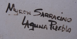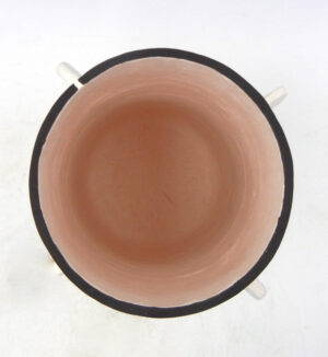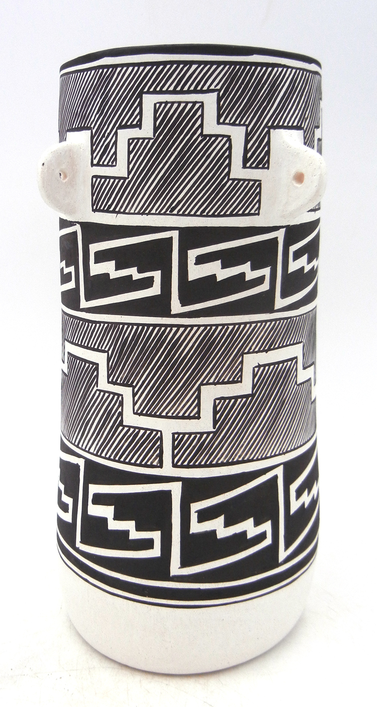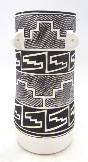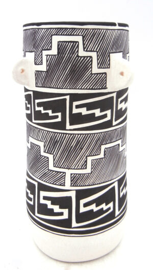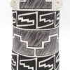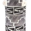 Handmade by Laguna potter Myron Sarracino and featuring hand painted weather patterns, this incredible piece takes on the more contemporary shape of a cylinder, a new style for Myron.  The piece’s rim is painted solid black, giving way to black and white patterns including fine lines, which generally signify rain, steps, and clouds.  The base of the piece is left white, while four rounded, half moon handles are attached toward the top of the piece.  9 1/8″ tall x 4 1/2″ wide.