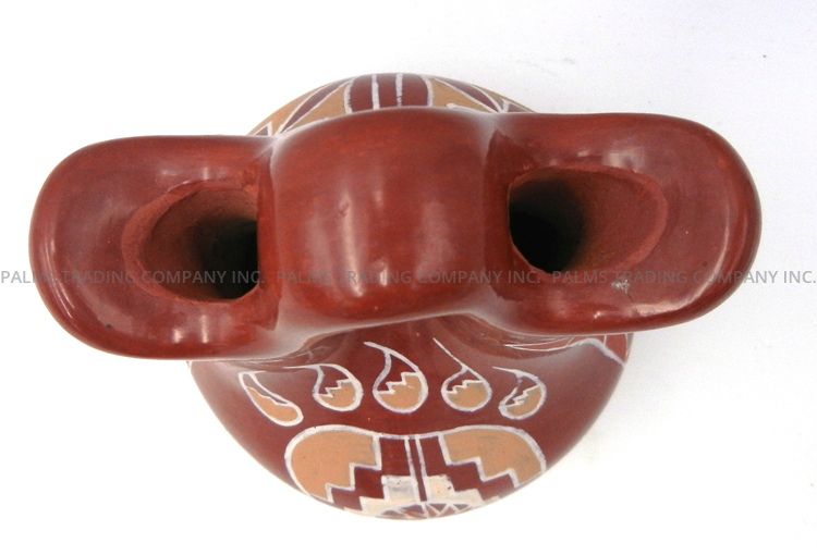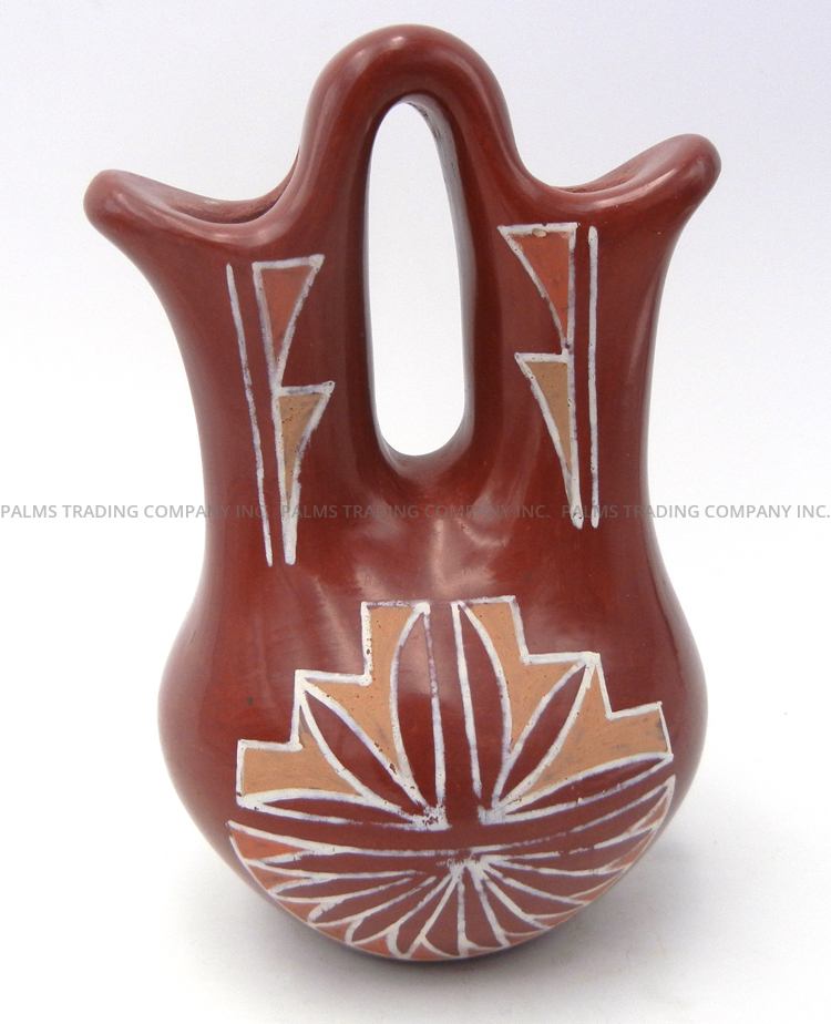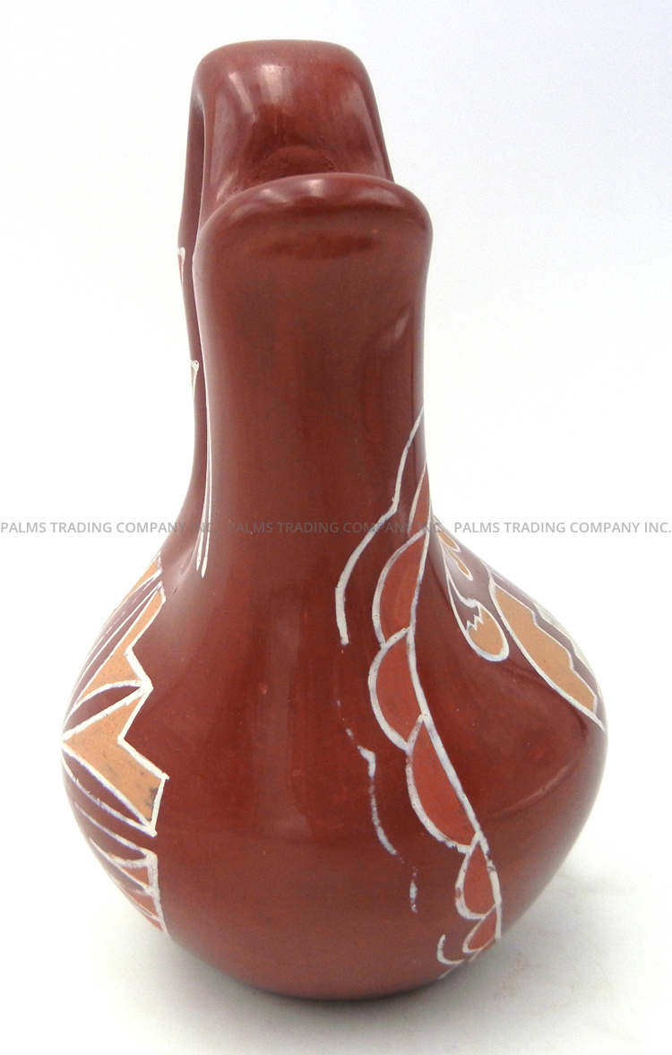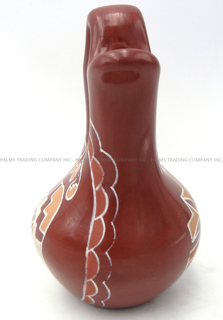 Finished with a brilliant stone polish, this stunning, traditional wedding vase by Santa Clara potter Camille Moquino also showcases various traditional hand painted designs.  One side of the vase is painted with a bear paw that includes multiple geometric and step designs, bordered on the sies of the vase by cloud patterns, while the opposite side of the vase features rain patterns along the front of the spouts and a step, feather and floral design at the center.  Patterns are painted in buff and white on both sides of the vase.  6 1/2″ tall x 4″ wide.
