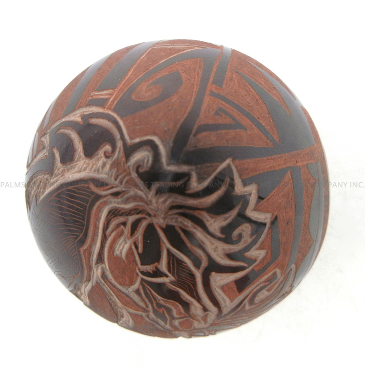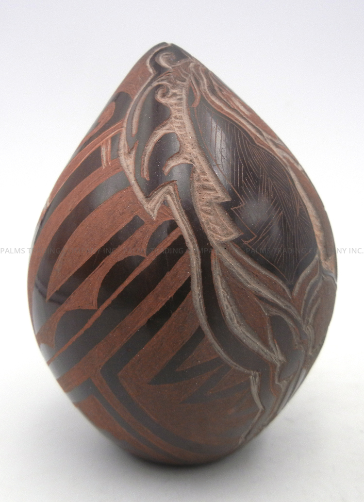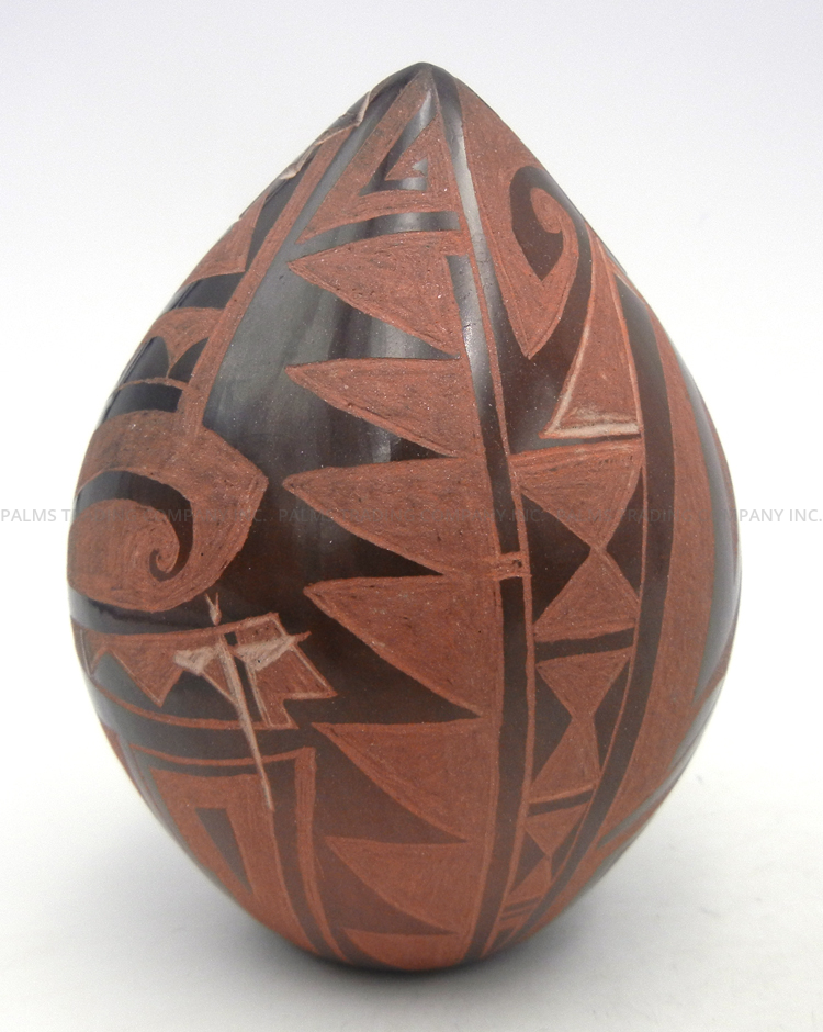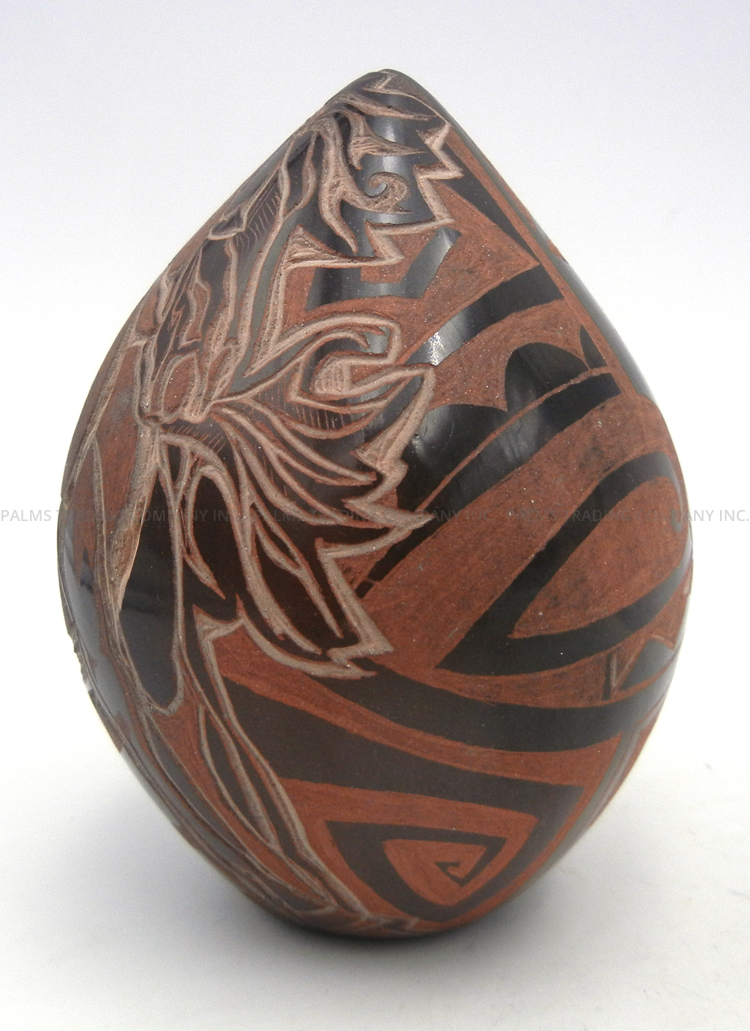 A unique, handmade tear drop shaped seed pot is expertly etched with an incredible horse pattern and polished to a high shine in this impressive piece by Santa Clara potter Dusty Naranjo. The piece features a gorgeous spectrum of brown coloration, lending itself beautifully to its intricately etched patterns, the principal of which is a horse with a flowing mane and tail. Various geometric designs as well as light etching of fine lines comprise the remainder of the work along the piece, while the darker brown portions are stone polished to a high shine. In many Native American cultures, the horse represents mobility, strength, power and stamina. 3 3/4″ tall x 2 7/8″ wide.