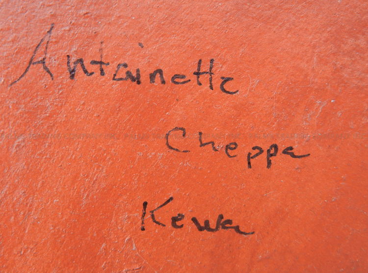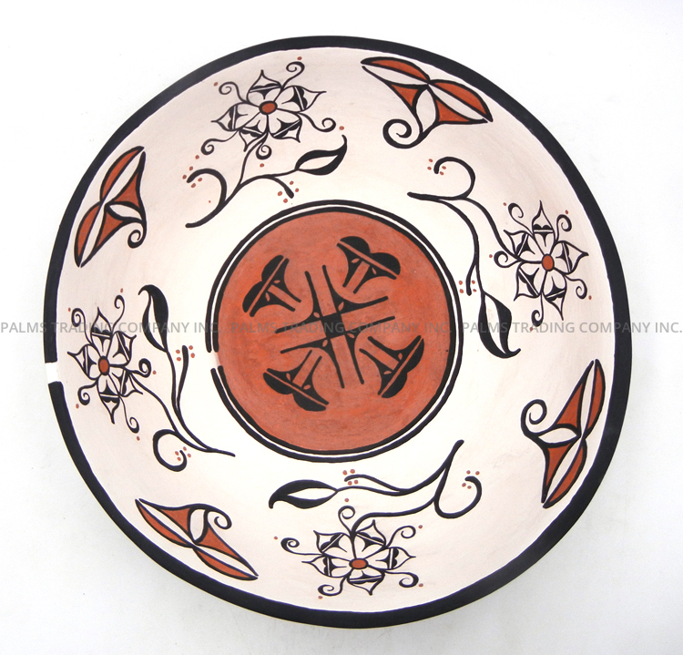 Santo Domingo potter Antoinette Cheppa impressively formed this large bowl by hand, then covered both inside and outside with various hand painted patterns atop its gorgeous buff backdrop.  The bowl showcases a black painted rim, giving way on the outside to differing, reoccurring weather patterns in black and red, including clouds and fine lines, which represent rain.  The inside of the piece is painted with reoccurring cloud and flower patterns along the walls, as well as additional cloud and rain designs painted in black atop the circular base, which is painted entirely red.  13 1/2″ diameter. 4 1/2″ tall.