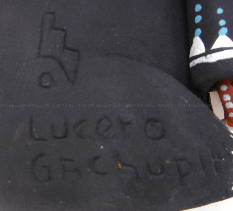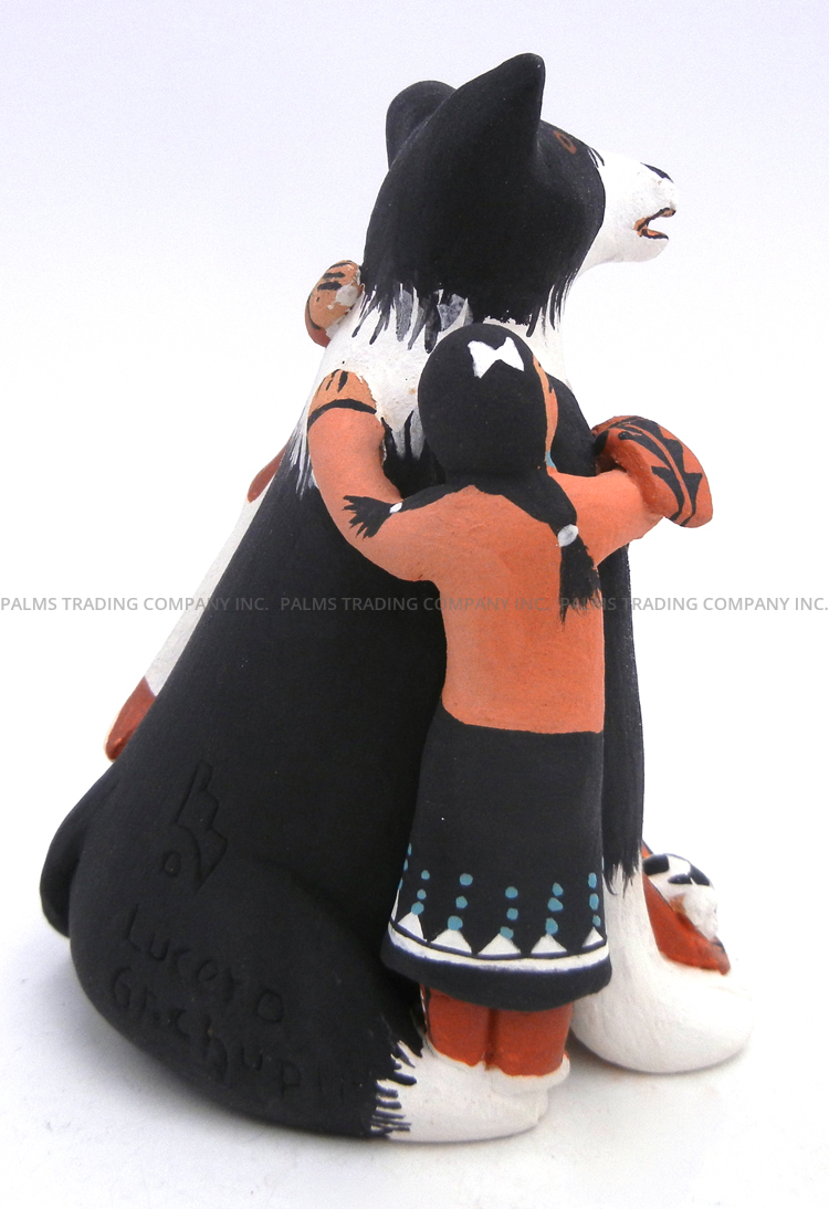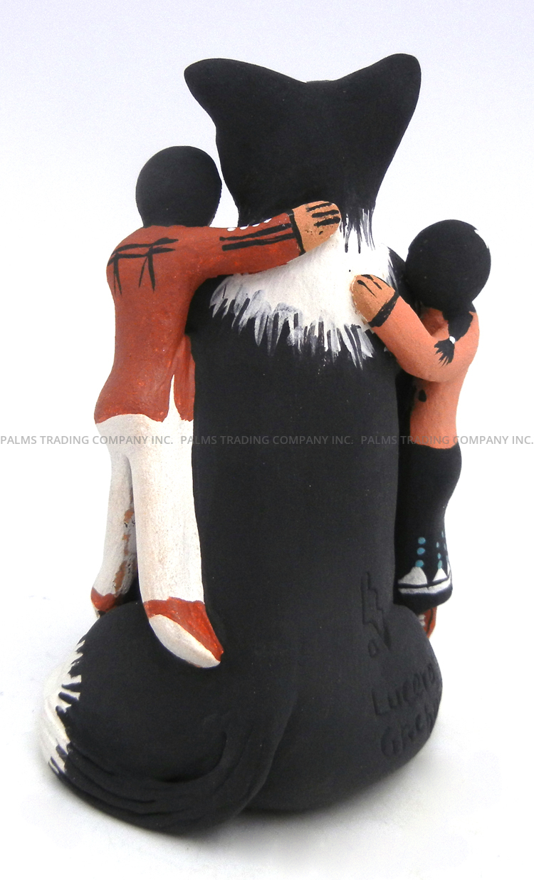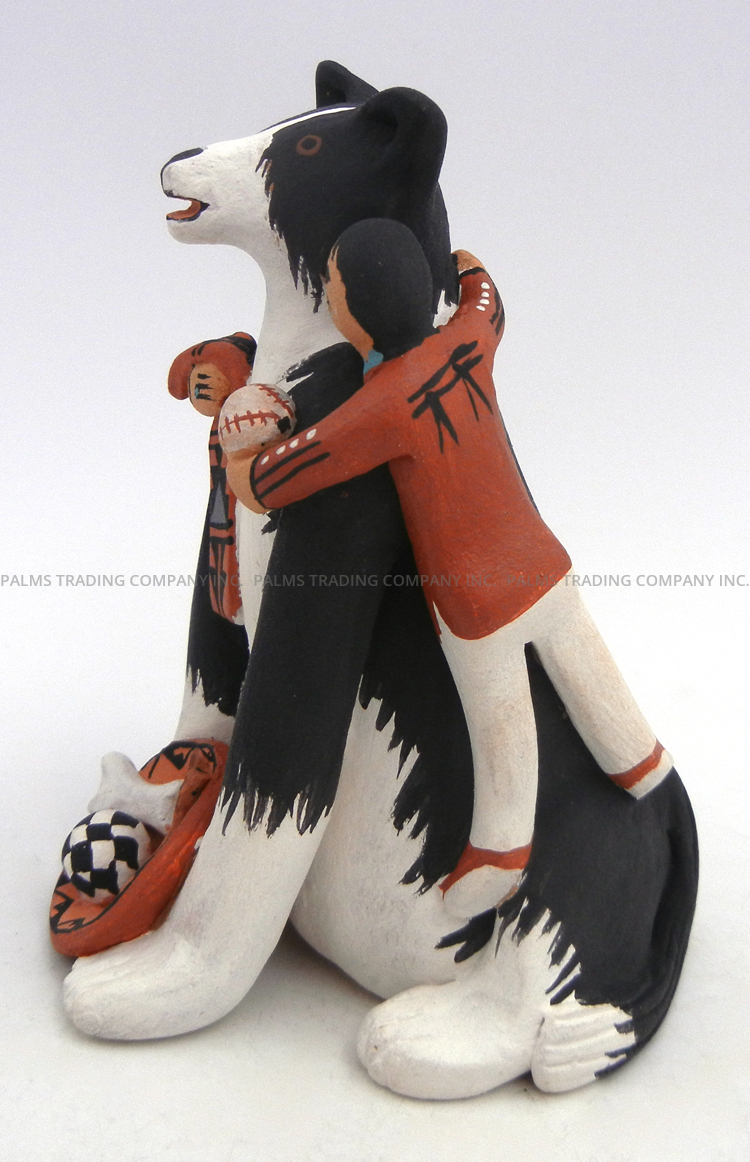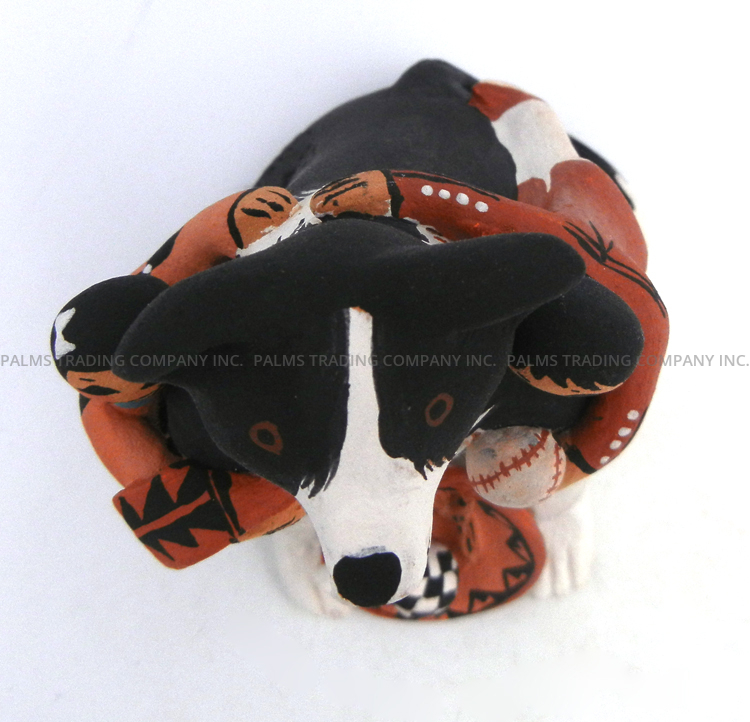 An adorable, seated black and white border collie is flanked by two children in this wonderful storyteller figurine by Jemez potter Carol Lucero Gachupin. One child hangs on to each of the dog’s shoulders along its front legs, the girl holding a blanket and the boy, a baseball. Each child’s eyes are wide and mouth is painted in a smile, while a basket holding a bone, a stick and a soccer ball rests between the dog’s front paws. 5″ tall x 3 1/2″ wide x 4″ deep.
