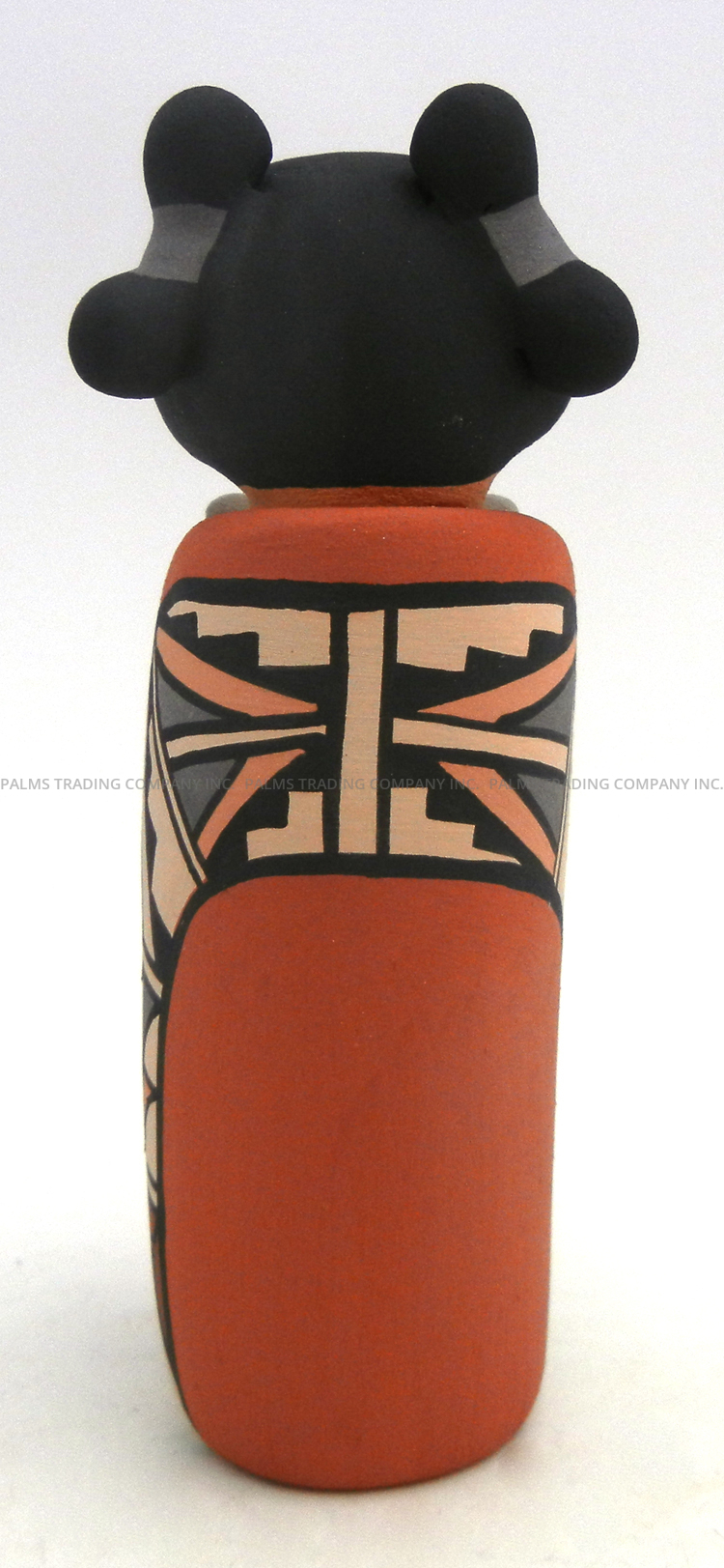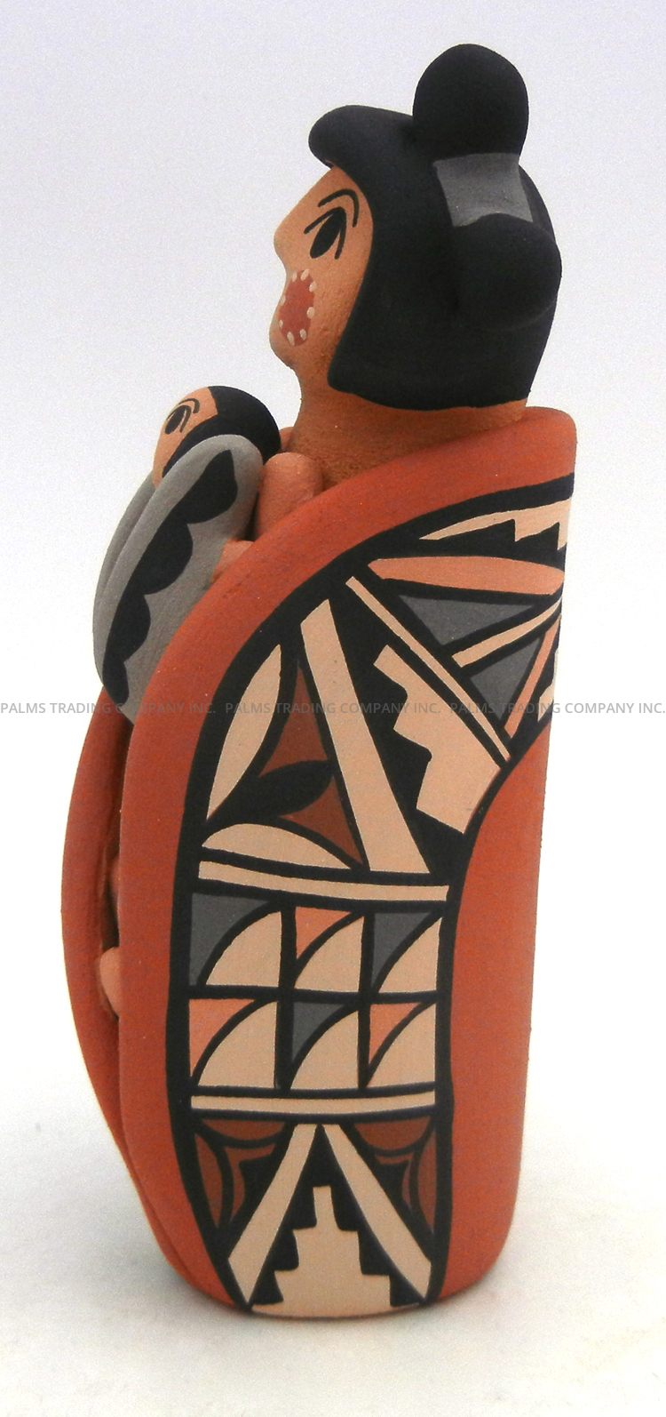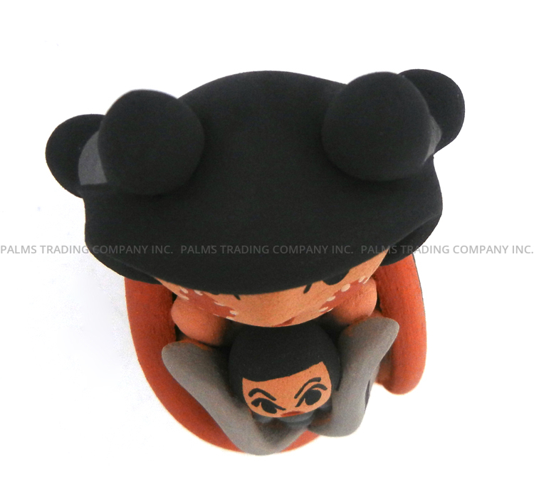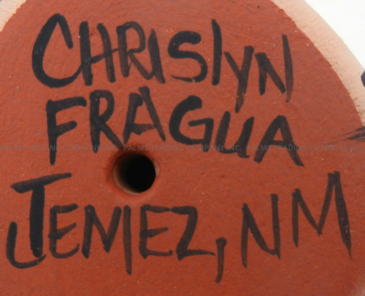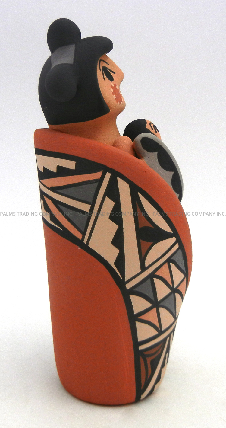 Handmade by Jemez potter Chrislyn Fragua, this gorgeous figurine features a standing corn maiden with a child maiden along her body.  The larger of the two maidens showcases wide, expressively painted eyes, rosy cheeks and an open mouth, while the child’s eyes and mouth mimic that of its mother.  The maiden is encased in a red painted husk, the back of which features various traditional patterns painted in buff, grey, pink, red, and black, while the child is encased in a gray husk painted with black accents. Corn kernels finish the front of each figure’s body.  5 5/8″ tall x 2″ wide x 2″ wide.