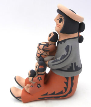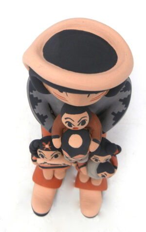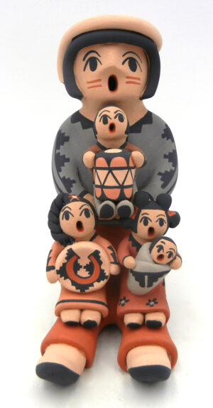 Handmade by Jemez potter Chrislyn Fragua, known for her adorable storyteller figurines, this lovely piece showcases a seated man and four children.  One boy rests on the mans interlocked hands, holding a drum, while two girls sit on his lap: one holding a basket and one holding a swaddled baby.  Each of the figures, including the baby, has an open mouth and wide, expressive eyes, while the man’s face is painted with horizontal fine lines.  The man is painted in grey and red clothing with black accents, while each of the girls wears a red dress with black accents.  The boy is painted i brown and grey, and the baby in a grey and black swaddle.  5 1/2″ tall x 2 1/2″ wide x 4 1/4″ deep.