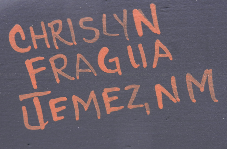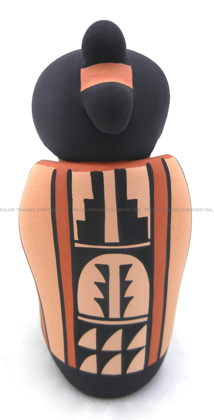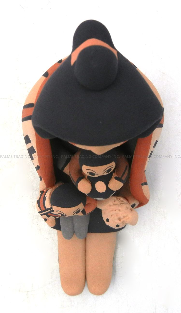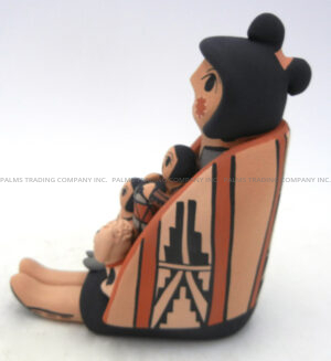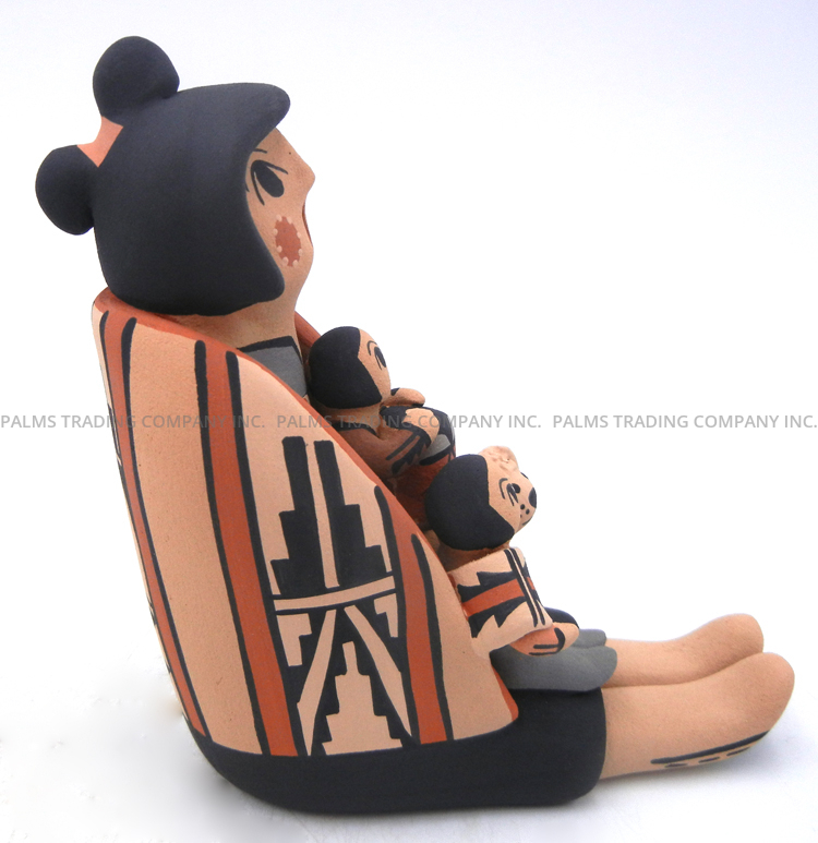 Two children and an adorable dog rest in the lap of a seated woman in this traditional, handmade storyteller figurine by Jemez potter Chrislyn Fragua. The woman rests with both legs outstretched, a shawl draped over her shoulders painted in various traditional patterns in black and red. The woman’s eyes are expressive, cheeks rosy and mouth open, while two children and a dog rest in her lap. One child plays a drum, while the other has a blanket slung over one shoulder. Each child also features expressive eyes and an open mouth, while the dog, buff and black in color, appears to be smiling. 5 1/2″ tall x 2 1/2″ wide x 4 1/2″ deep.