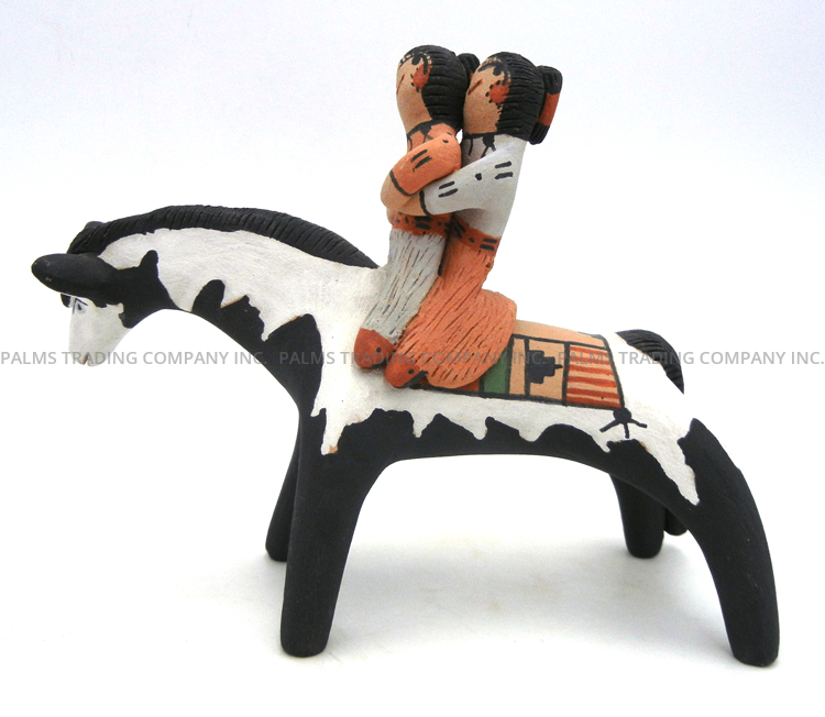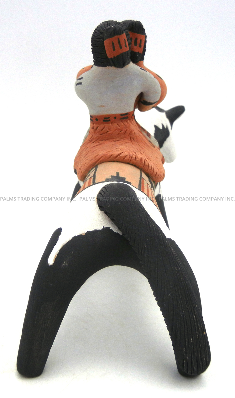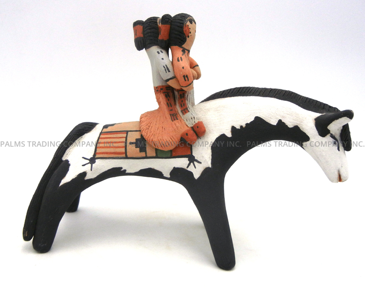 Handmade by Jemez potter Clifford Fragua, this fun figurine features two children riding a horse. The horse’s body curves slightly, a buff, red and black blanket painted along its black and white back, two girls sitting at the front of the blanket, toward the horse’s neck. The horse’s head is bowed, its eyes wide, while the girls hold hands and smile. 5 5/8″ tall x 7″ long x 3″ wide.