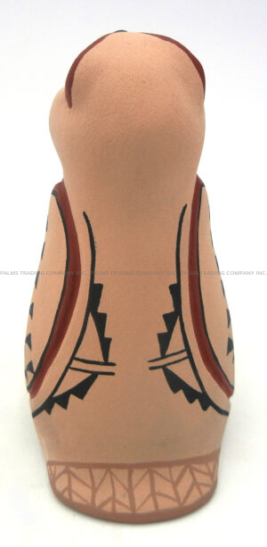 An adorable owl sits with two owlets at the front of its body in this fun, unique storyteller figurine by Jemez potter Diane Lucero.  Each figurine is predominantly buff, with the larger owl painted in reddish brown and black accents, while the smaller owlets feature grey and black accents.  Each figure’s wings rest at its sides, with the larger owl showcasing traditional weather patterns painted along its back.  5 1/4″ tall x 2 1/2″ wide x 3 1/2″ deep.