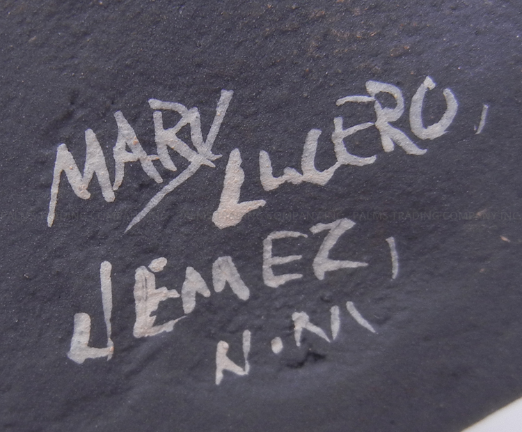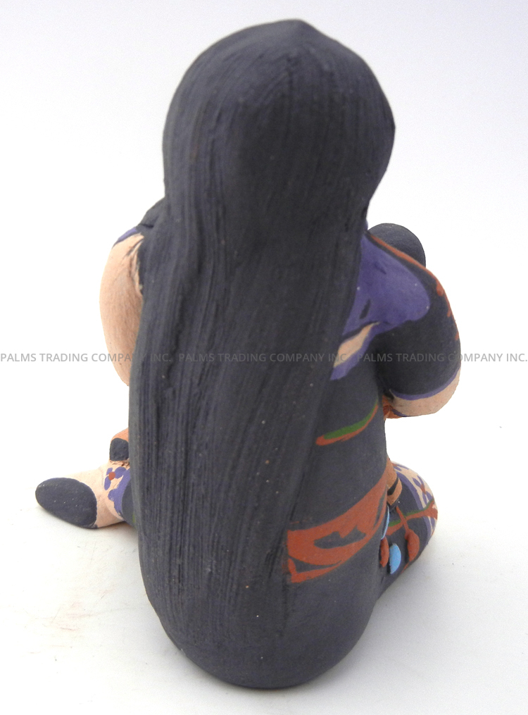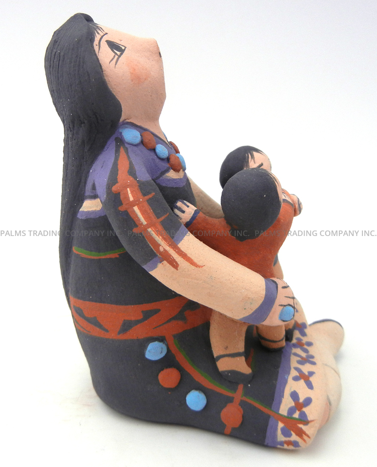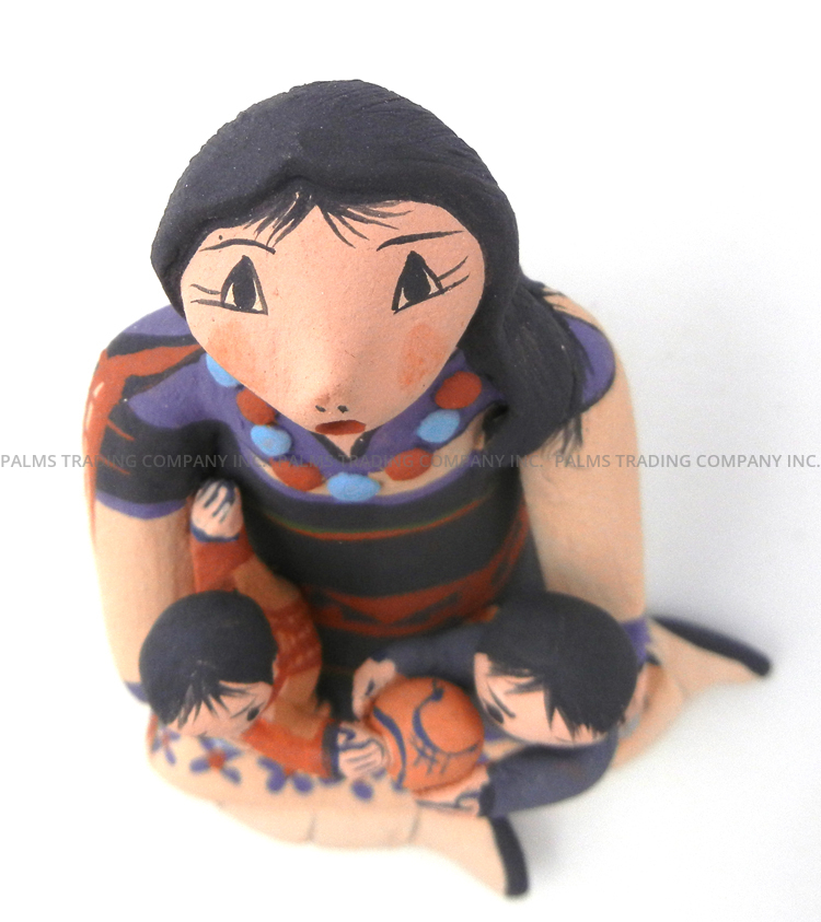 Handmade by Jemez potter Mary Lucero, this beautiful, traditional storyteller figurine showcases a seated woman and two children.  The woman rests with her knees bent, both legs off to the same side, while two children stand and play with a ball on her lap.  The woman’s mouth is open and eyes are expressive, while the children’s mouths remain closed.  The woman is painted in vibrant turquoise, purple, and red accents while one of the children is painted in grey and buff and the other in red and buff.  3 3/4″ tall x 3″ wide x 2 3/4″ deep.