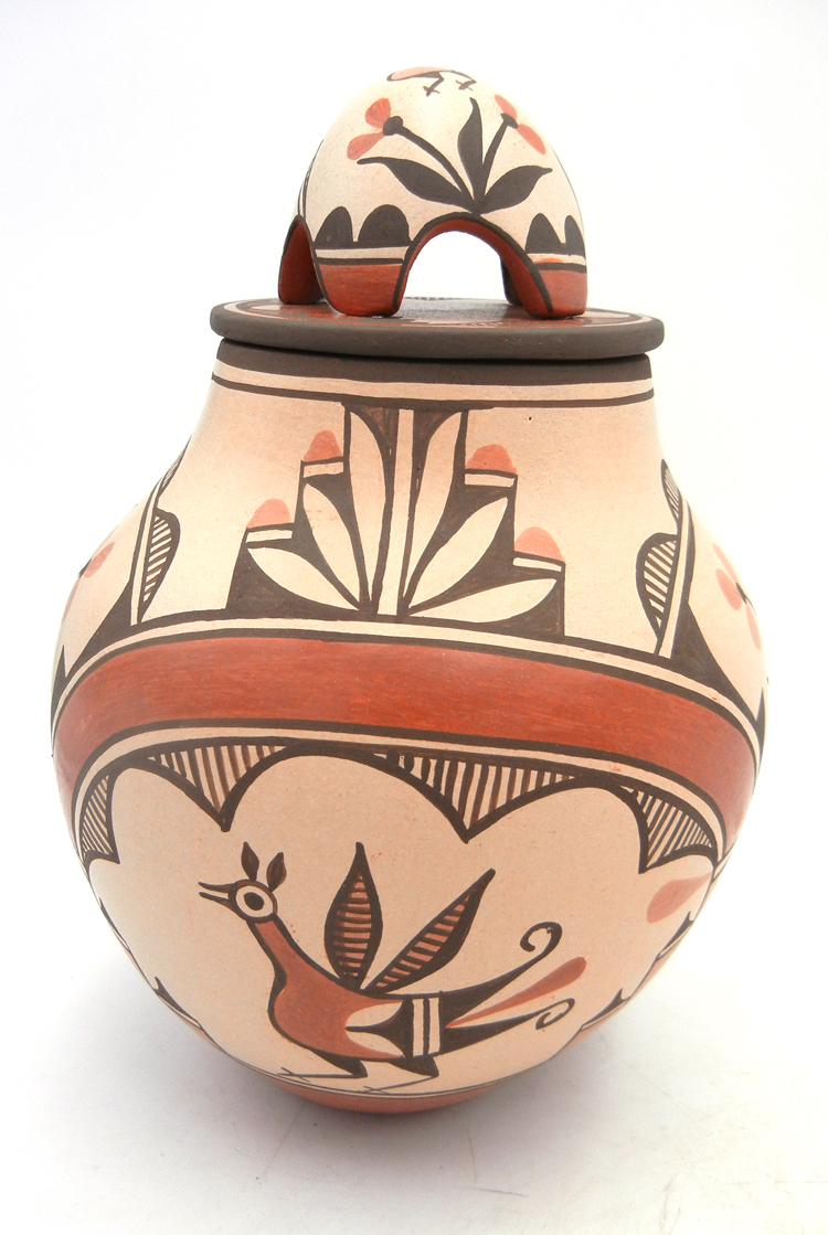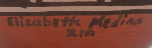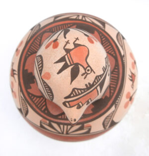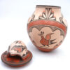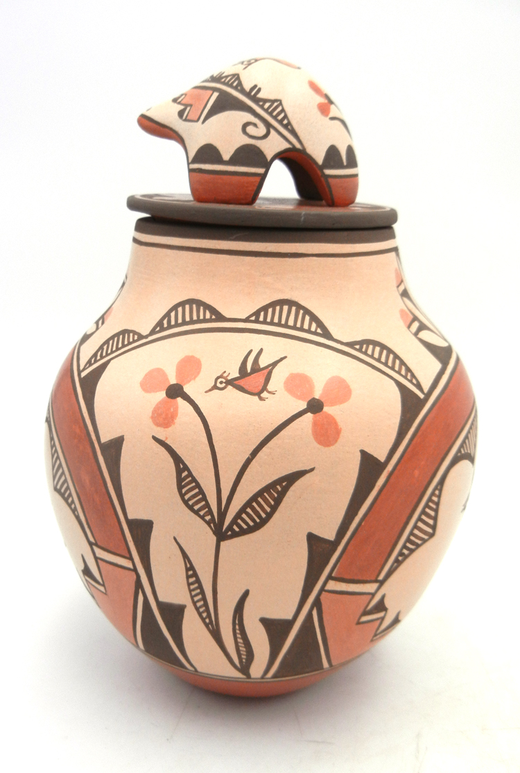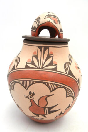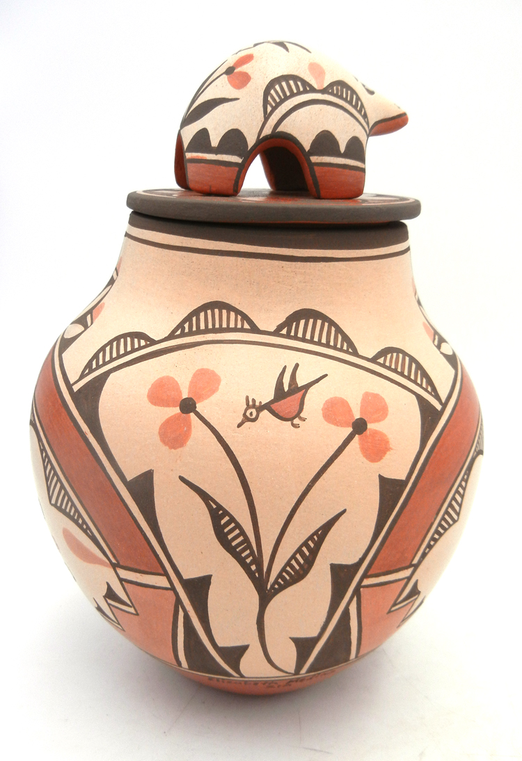 Created by well-known Zia potter Elizabeth Medina, this impressive vase features Elizabeth’s signature bear lid and various bird designs.  The body of the vase is painted in red and black along the buff backdrop, featuring several Zia birds as well as rainbow bands, kiva steps, and flowers.  The top of the piece’s lid is painted entirely red with black fine line (rain) and cloud accents, while the bear showcases an additional bird, weather patterns, and flowers.  10 1/2″ tall including lid x 6 1/2″ wide.  7 3/4″ tall without lid.