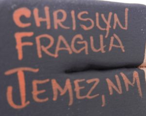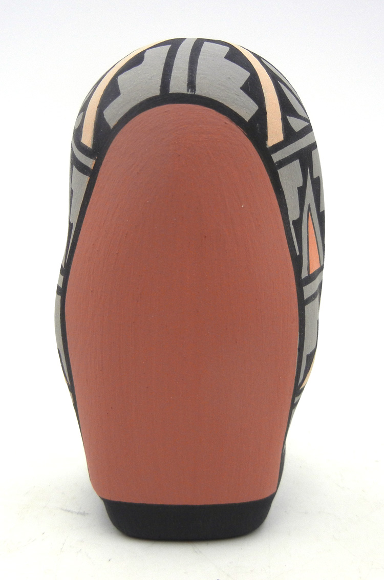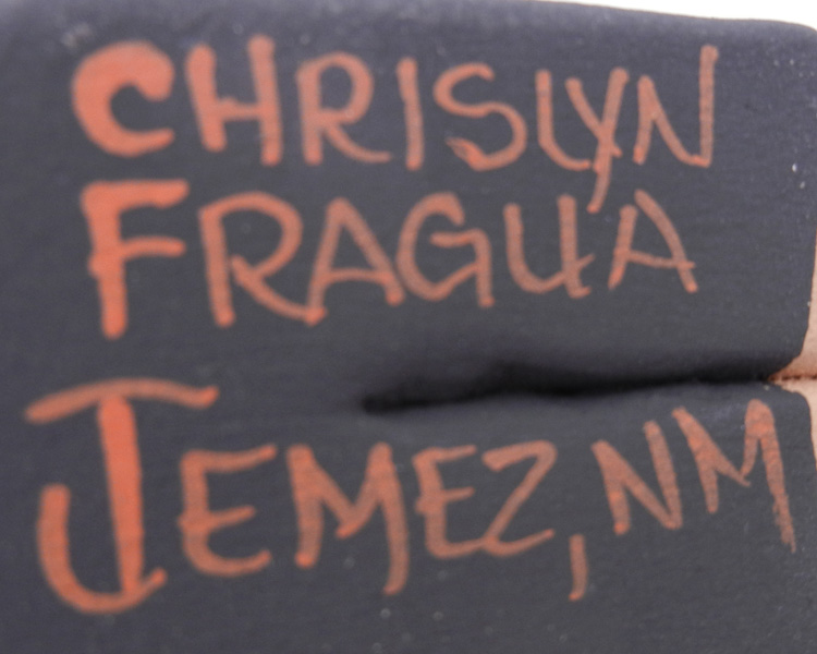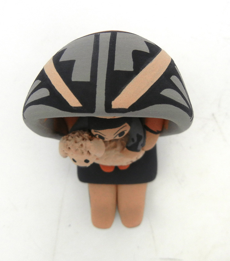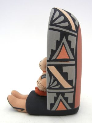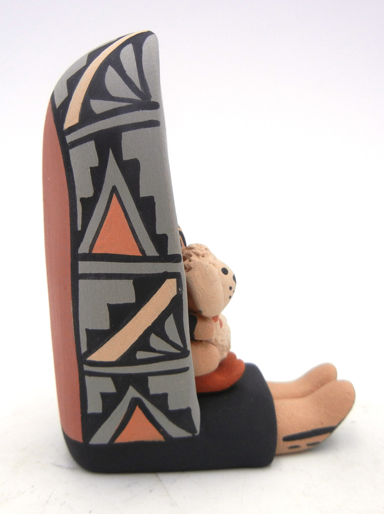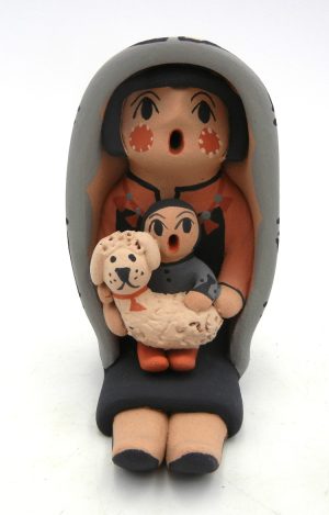 One child and one dog sit on the lap of a seated woman in this small, precious storyteller figurine by Jemez potter Chrislyn Fragua. The woman sits with her legs outstretched, a full skirt surrounding a majority of her lower half. One child rests in her lap, a dog sitting in his lap, while boy and woman are presented with open mouths and wide, expressive eyes. The woman’s hair is pulled into a bun atop her head, her cheeks are rosy, and various step patterns in black adorn her buff and red clothing. 3 5/8″ tall x 2 3/4″ wide x 3 1/8″ deep.