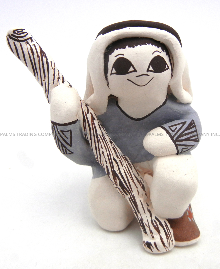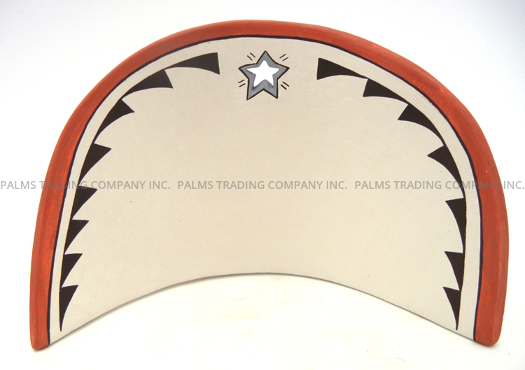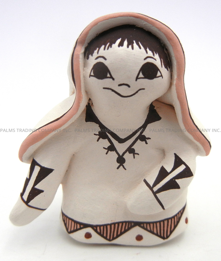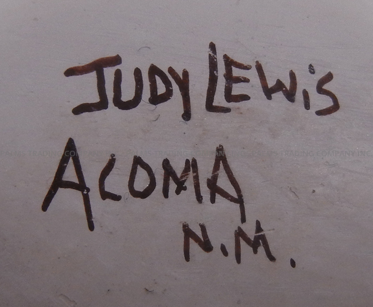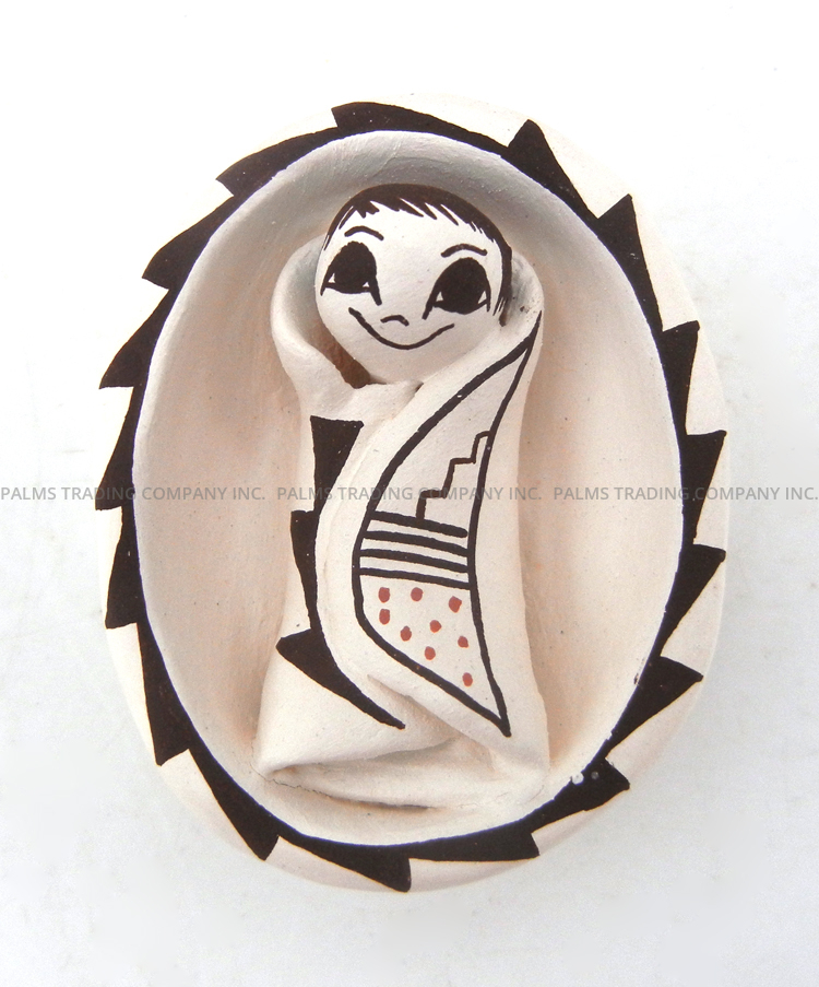 Handmade by Acoma potter Judy Lewis, this beautiful nativity scene comprises four pieces: a background/backdrop piece, a Joseph figurine, a Mary figurine, and a baby Jesus figurine in a manger.  The backdrop piece is half moon shaped and slightly curved, the border painted solid red, followed by a cut out star painted blue with black accents at the center, bordered on each side by reoccurring weather designs.  Both Mary and Joseph figurines are depicted kneeling, Mary on both knees and Joseph on one, Joseph holding a staff in one hand. Both figurines showcase garments along their heads, with Joseph painted in blue, brown and black and Mary in pink and black.  Baby Jesus lies in a manger, a smile painted on his face, his swaddle painted in black and red patterns and the manger finished with painted designs along the top border.  Backdrop piece measures 3 3/4″ tall x 5 3/4″ wide x 2″ deep.  Mary measures 2 1/8″ tall x 2″ wide x 1 1/4″ deep. Joseph measures 2 1/4″ tall x 2″ wide x 1 3/4″ deep.  Jesus measures 1 7/8″ long x 1 1/2″ wide x 3/4″ tall.