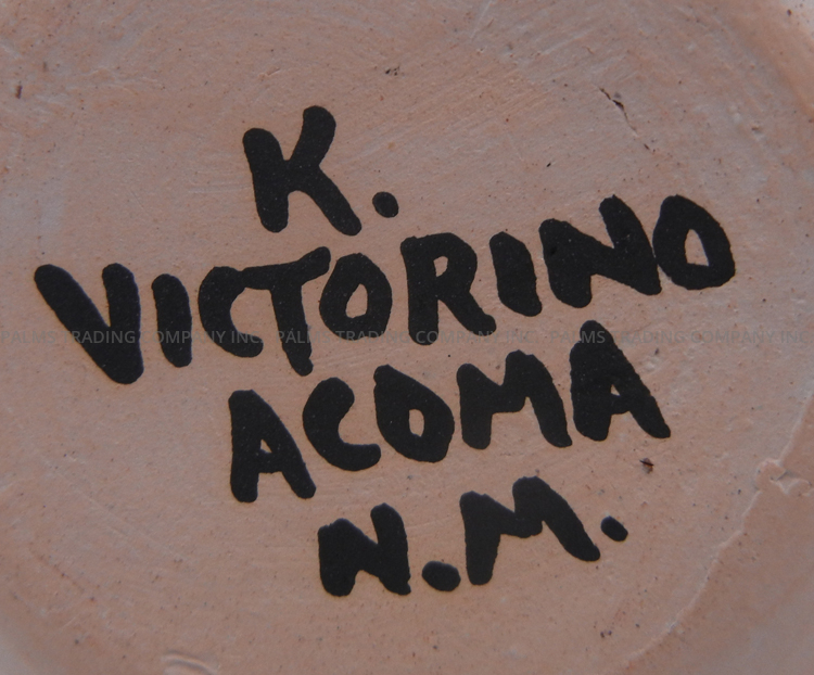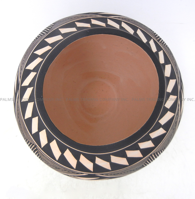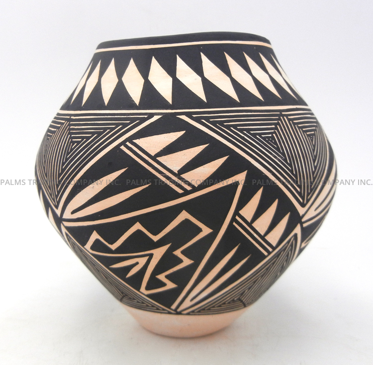 Black and white hand painted weather patterns cover the entire body of this lovely, smaller scale handmade jar by Acoma potter Kathy Victorino. Patterns include whirlwinds, clouds and lightning, while the rim of the piece is painted solid black and the base is left entirely white. 5″ tall x 5″ wide.