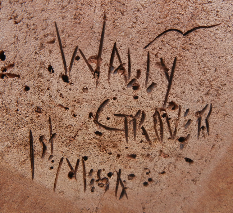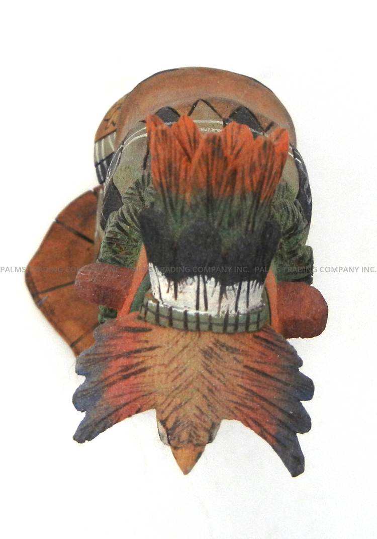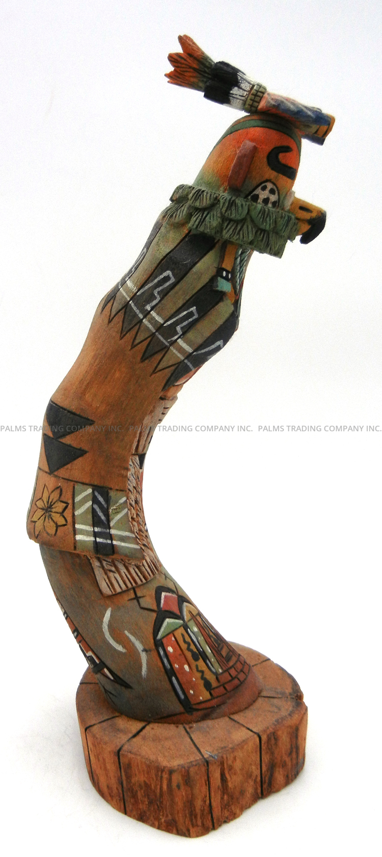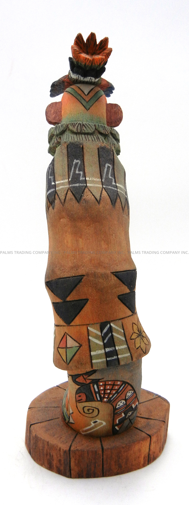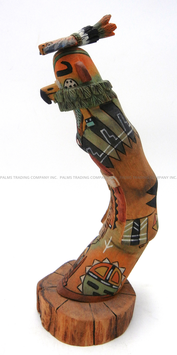 Featuring exquisite detail, this hand carved kachina doll by Hopi artist Wally Grover depicts a hummingbird. The curved piece stands atop a round wooden base, its body featuring various traditional designs including a sunface, clouds and rain, tadpoles, a serpent, and flowers. The body is painted in various sahdes of green, black, red, yellow, and white. A shawl is draped over the hummingbird, also showcasing intricately carved detail, while a yellow and black beak protrudes from the face, its curved eyes painted black. The head of the kachina is finished with a detailed parrot, its wings outstretched forward and tail feathers protruding backward. 11″ tall x 4″ wide x 4″ deep.