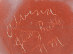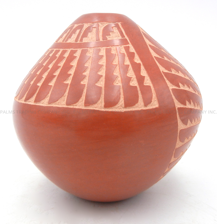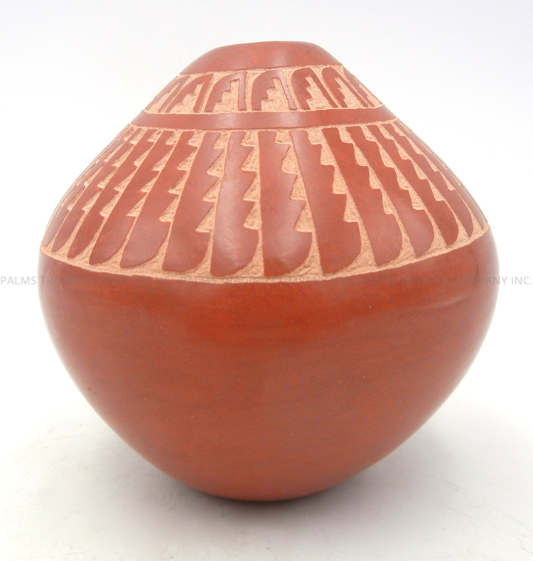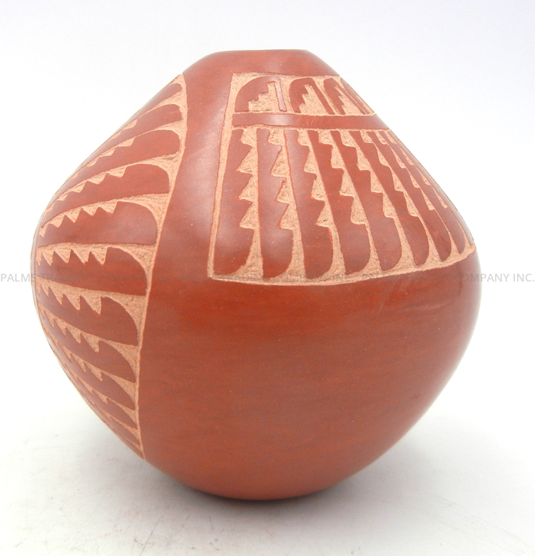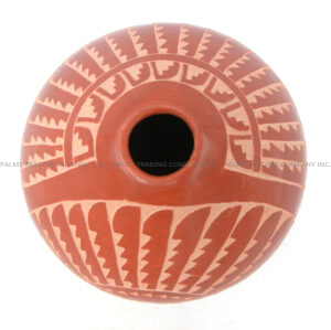 Handmade by prolific Jemez potter Alvina Yepa, this lovely little seed pot showcases various, intricately etched patterns and is finished with a gorgeous, high shine stone polish.  The piece widens from its narrow opening, a majority of the front and half of the back and sides showcasing etched, traditional patterns, including corn stalks as the centerpiece along the front, as well as feather and step patterns.  The etching creates a beautiful juxtaposition between red and buff coloring, while the sections of the piece not exposing the buff color are stone polished, creating additional contrast between the buff color’s texture.  4 1/4″ tall x 4″ wide.