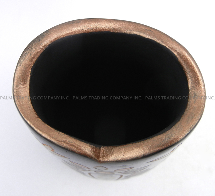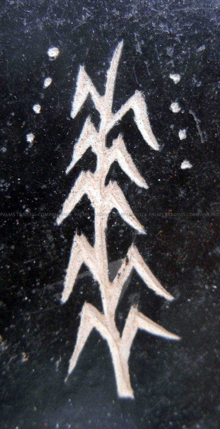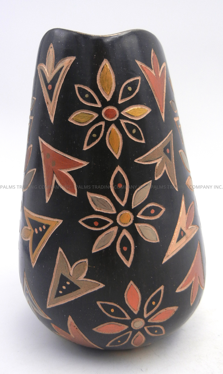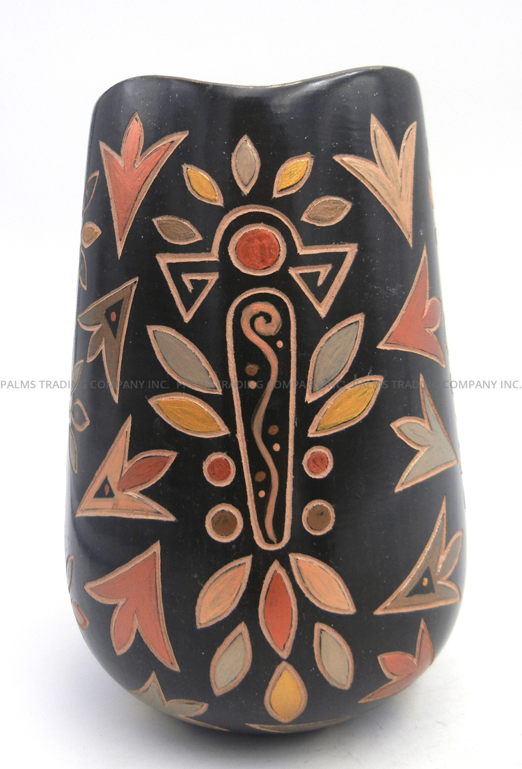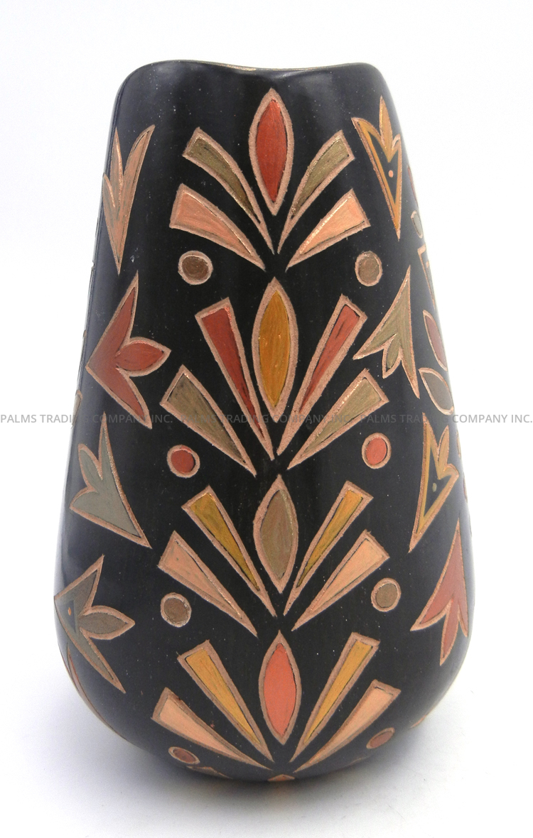 Handmade by prolific Jemez potter Glendora Fragua, this stunning vase features an etched harvest design along its surface featuring multiple components, the design elements painted by hand in various commercial paint colors, including black, gold, and metallic greens and reds.  The scalloped rim of the piece is painted metallic gold, giving way to the piece’s black body which is etched with a single kachina at the center on each side, one featuring water designs and the other, corn patterns.  Each kachina is surrounded by various floral and leaf patterns painted in the aforementioned colors, their edges deeply grooved within the vase’s black body, showcasing the buff color underneath.  6″ tall x 4″ wide.