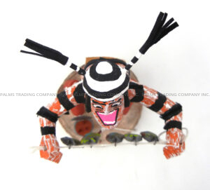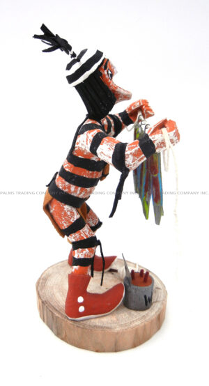 True to her signature style, this fun koshare kachina figurine by Navajo carver Bertha Wood features a fisherman holding a line of five caught fish. He stands with knees bent and feet pointing toward one another, a string held between each hand, upon which five wooden fish hang. Each fish is painted in green, turquoise and red, while the koshare is painted in black and white accents with a big, wide smile. The piece is finished with a can of worms at the koshare’s feet and a spool of string poking out from underneath one foot. 7 1/4″ tall x 3 1/2″ wide x 3 1/2″ deep.