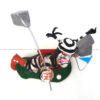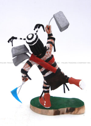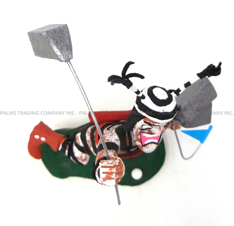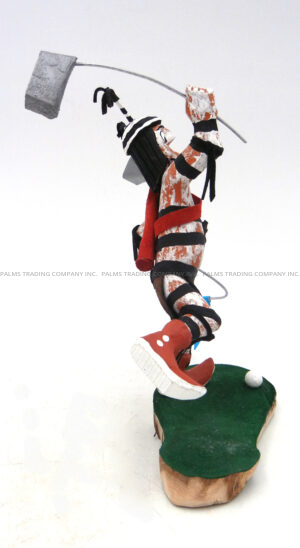 Carved by Navajo artist Bertha Wood, known for her koshare figurines, this fun kachina showcases a frustrated golfer, with fun, creative details. The koshare stands atop a wooden base, painted green to resemble grass, one foot lifted up behind him. A golf ball rests on the green, the golfer appearing to swing one club down toward it, the mangled flagstick held in his opposite hand. Additional clubs are slung over his shoulder in a felt golf bag, while the koshare is painted in black and white details and adorned with additional felt accessories. 7 7/8″ tall x 6 1/8″ wide x 4 1/2″ deep.