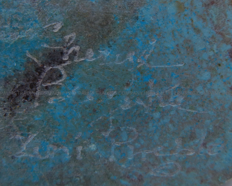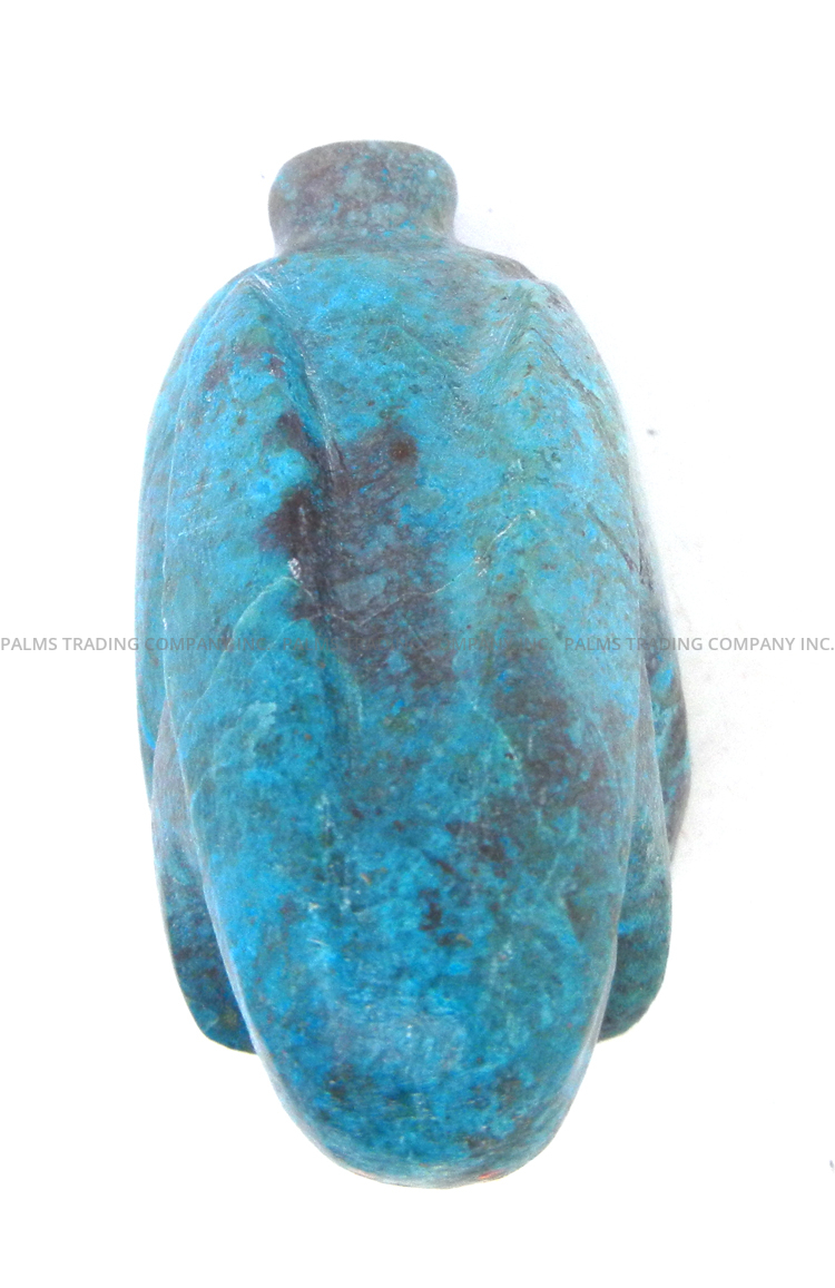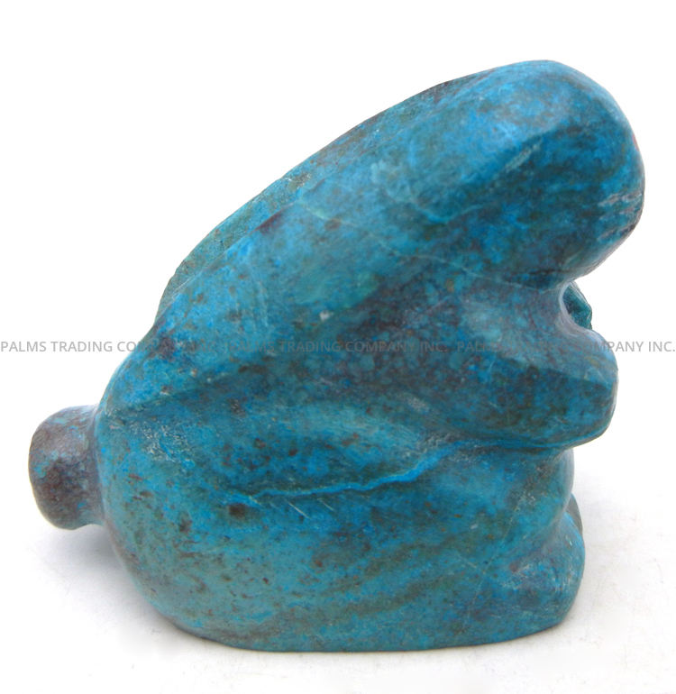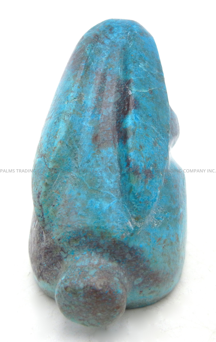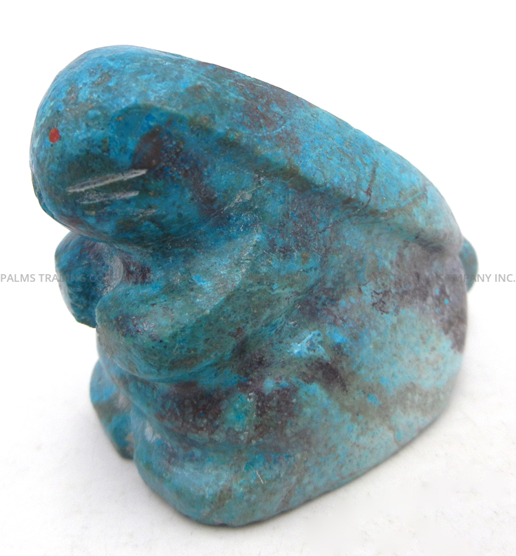 Carved entirely from a substantial piece of muted blue-green turquoise, this adorable fetish by Zuni artist Cheryl Beyuka depicts a rabbit. The rabbit features tiny coral inlaid eyes and etched whiskers, its ears pinned back along its head and limbs tucked into its front.  It is finished with a round turquoise tail.  In many Native American cultures, is considered a special guardian of women in childbirth and assures long life for children. 2″ tall x 1 3/8″ wide x 2 3/8″ deep.