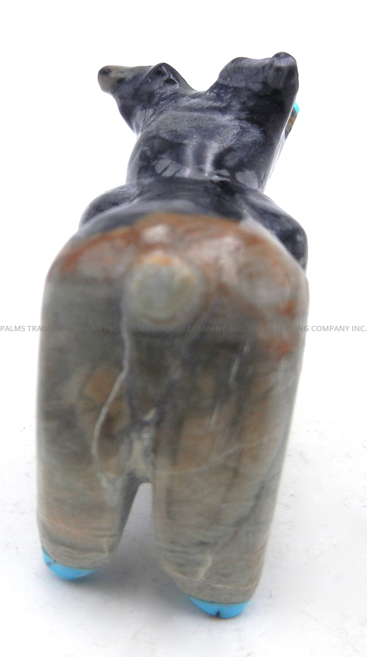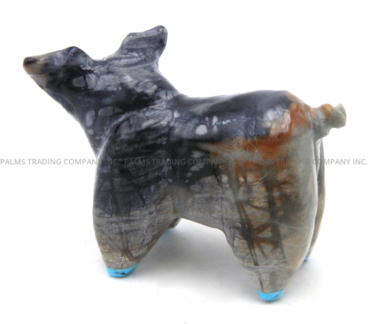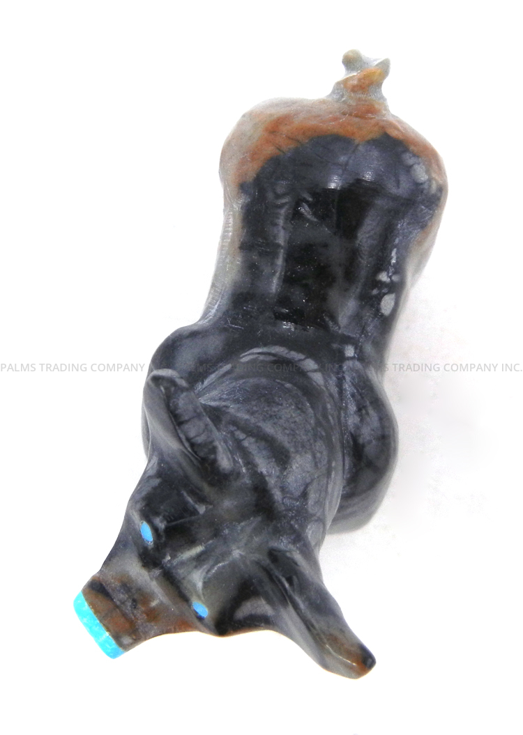 Black picasso marble is carved into an adorable pig in this fun stone fetish by Zuni artist Freddie Leekya. The piece varies black to brown in color and showcases turquoise accents at the nose, eyes and feet, while the pig is finished with a curled tail. 1 7/8″ tall x 1″ wide x 2 3/8″ long.