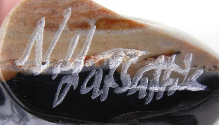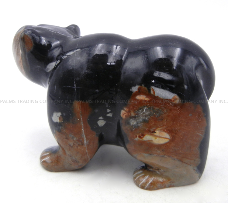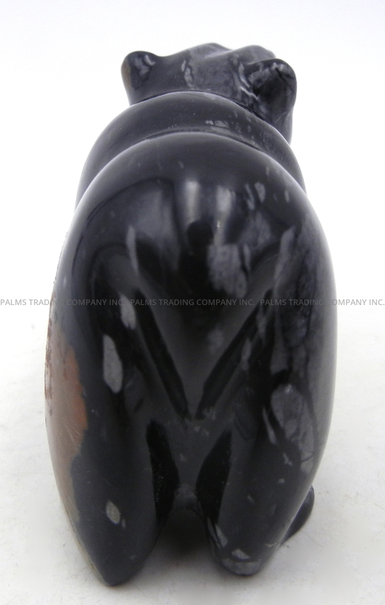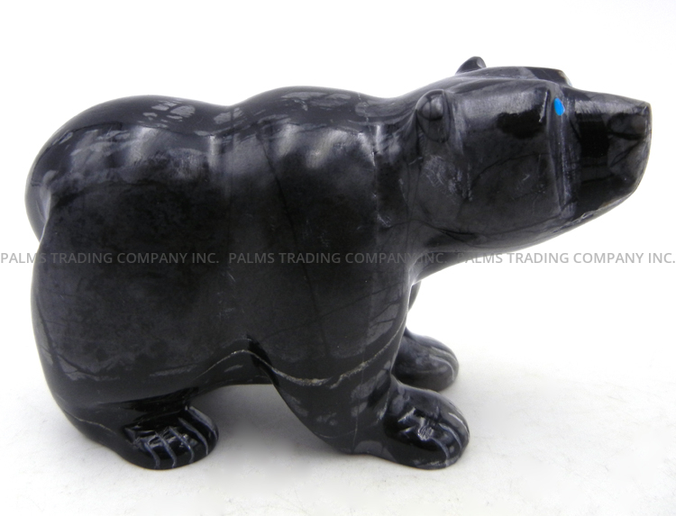 A thick, substantial piece of black and brown Picasso marble comprises the entirety of this exquisite bear fetish by Zuni carver Nelson Yatsittie. The bear stands on all four legs, its feet carved with fine lines and its head shifted slightly to one side. Its eyes are inlaid with turquoise, with one side predominantly black in color and the other half black and half brown, with hints of tan coming through. In most Native American cultures, the bear represents strength, introspection, healing, and the spiritual journey. 2 1/8″ tall x 1 1/4″ wide x 3 1/4″ long.