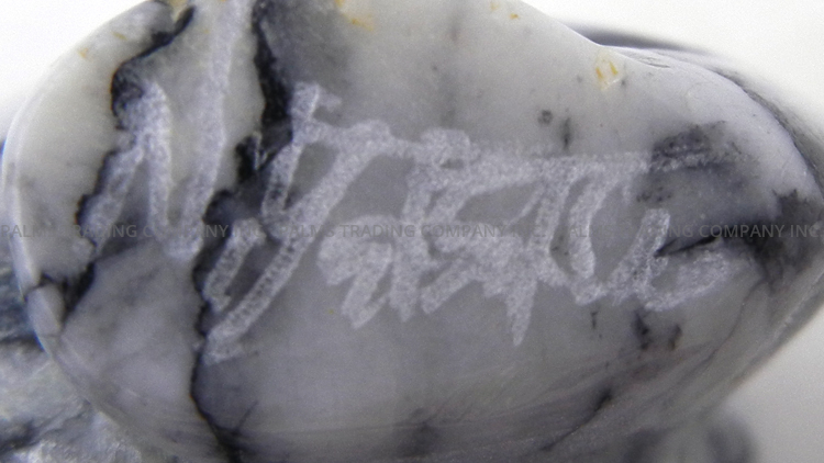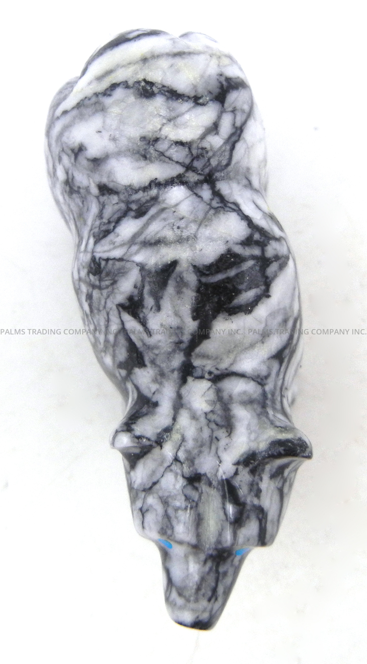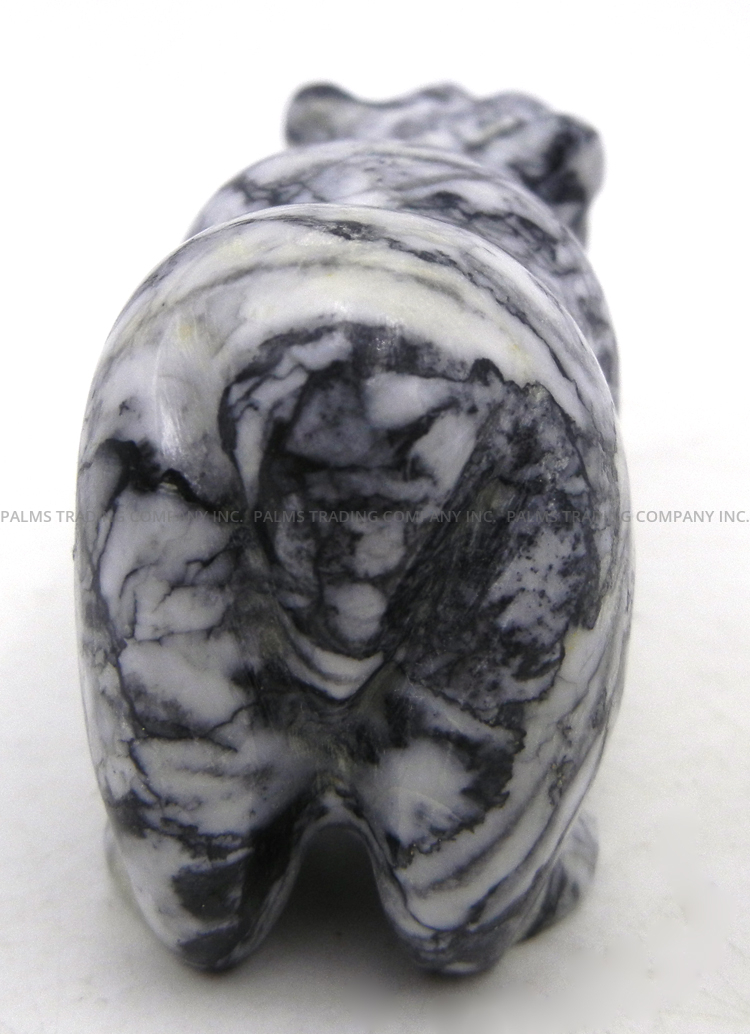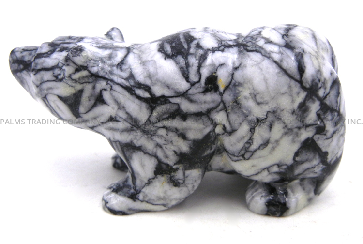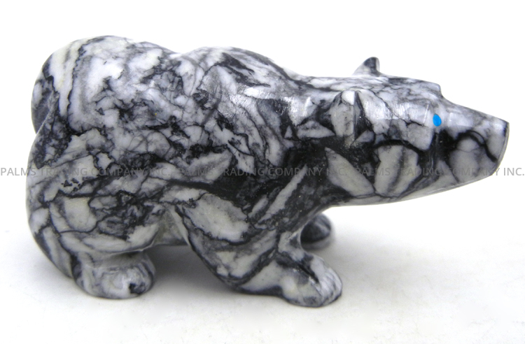 Marbled black and off-white pinolite is expertly carved to form a bear in this wonderful fetish by Zuni artist Nelson Yatsittie.  The bear stands on all fours, its paws etched with fine lines and eyes inlaid with turquoise.  In most Native American cultures, the bear represents strength, introspection, healing, and the spiritual journey.  1 1/4″ tall x 1″ wide x 2 3/4″ long.