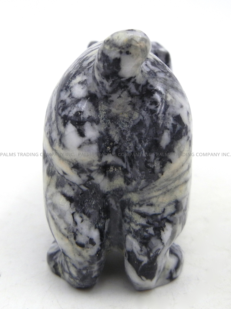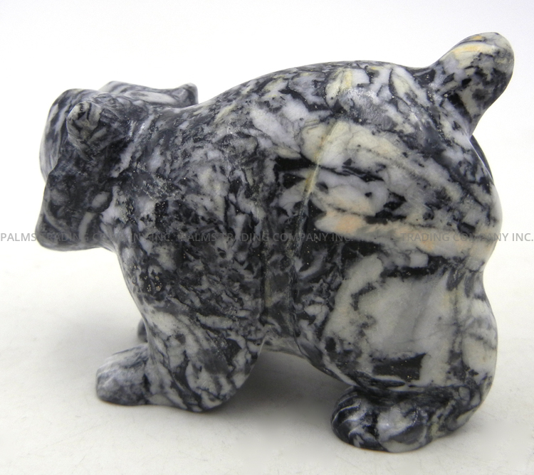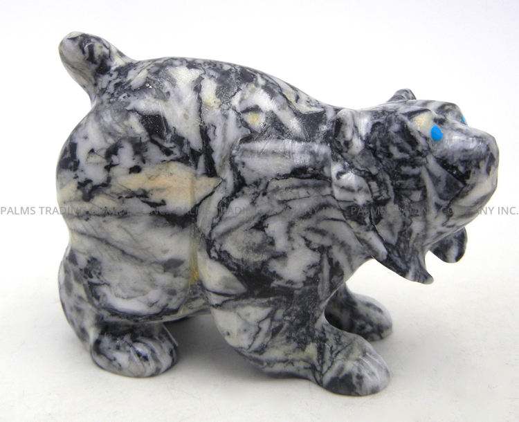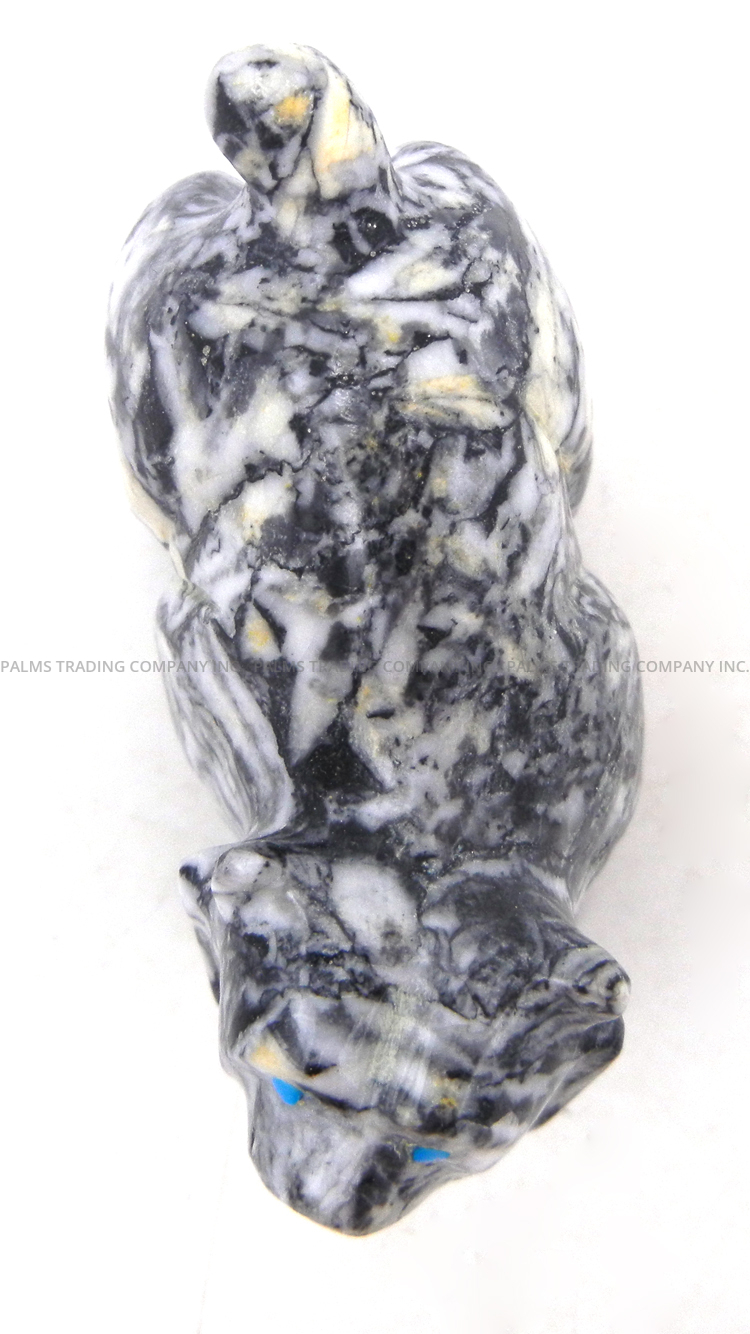 Carved from marbled black and off-white pinolite, this fun, traditional fetish by Zuni artist Nelson Yatsittie depicts a bobcat.  The bobcat is carved hunched down on its front legs, its backside slightly lifted, as if ready to pounce.  Its short tail extends backwards, while its eyes are inlaid with turquoise. In many Native American cultures, the bobcat is considered clairvoyant, and is said to know secrets. 2″ tall x 1 1/8″ wide x 2 1/2″ long.