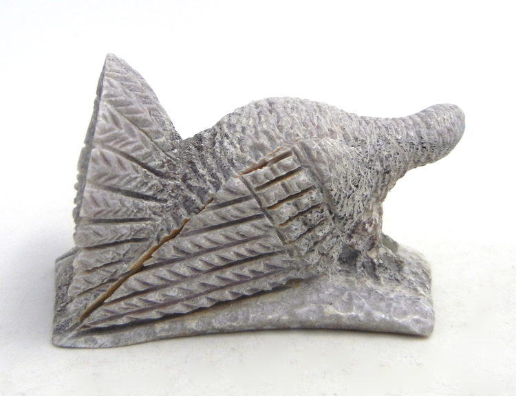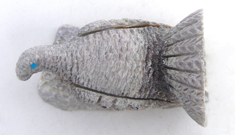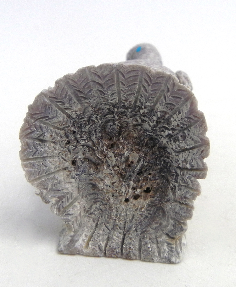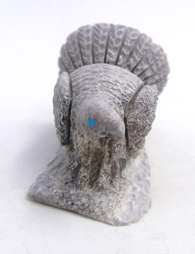 Emitting a more grey color, this impressive and intricate turkey fetish is carved from deer antler by Zuni artist Todd Loswayatee.  The turkey’s head is curved to one side featuring turquoise inlay eyes, its wings pinned to its sides and tail feathers fanned upward and outward, all carved with life-like texture.  In many Native American cultures, the turkey is considered smart, elusive and festive.  1 1/8″ tall x 1″ wide x 2″ long.